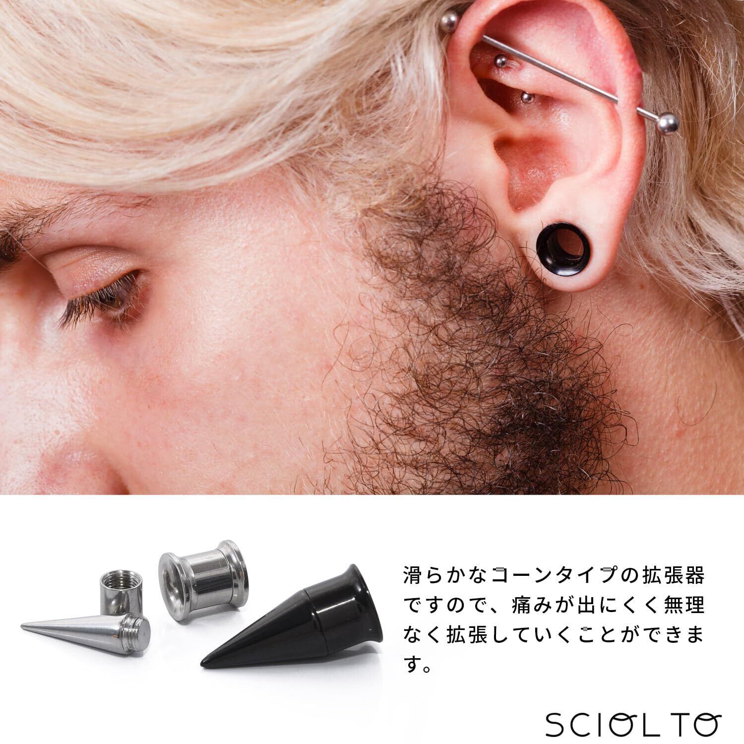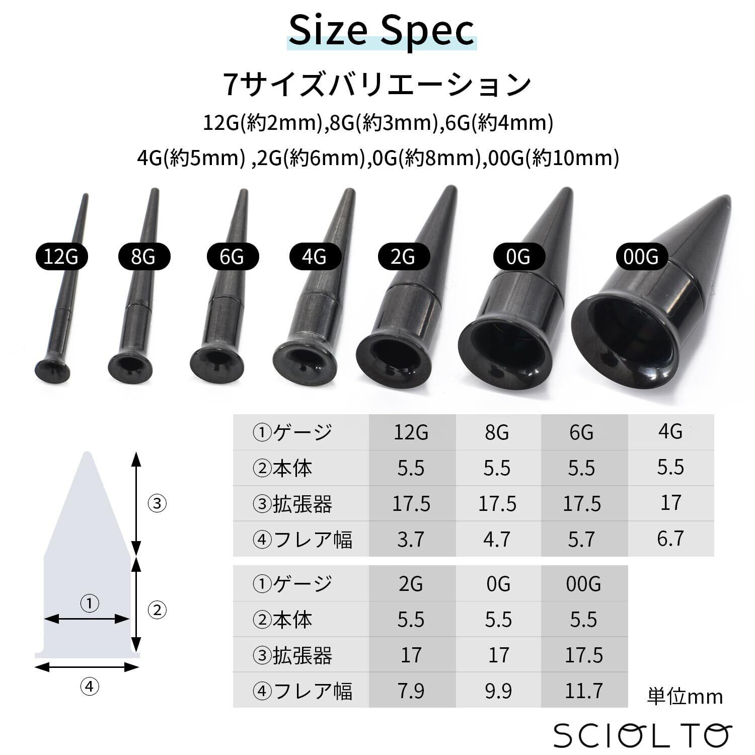 【サイズ】[12G]本体長さ:5.5mm 拡張器長さ:17.5mm フレア幅:3.7mm [8G]本体長さ:5.5mm 拡張器長さ:17.5mm フレア幅:4.7mm [6G]本体長さ:5.5mm 拡張器長さ:17.5mm フレア幅:5.7mm [4G]本体長さ:5.5mm 拡張器長さ:17mm フレア幅:6.7mm [2G]本体長さ:5.5mm 拡張器長さ:17mm フレア幅:7.9mm [0G]本体長さ:5.5mm 拡張器長さ:17mm フレア幅:9.9mm [00G]本体長さ:5.5mm 拡張器長さ:17.5mm フレア幅:11.7mm