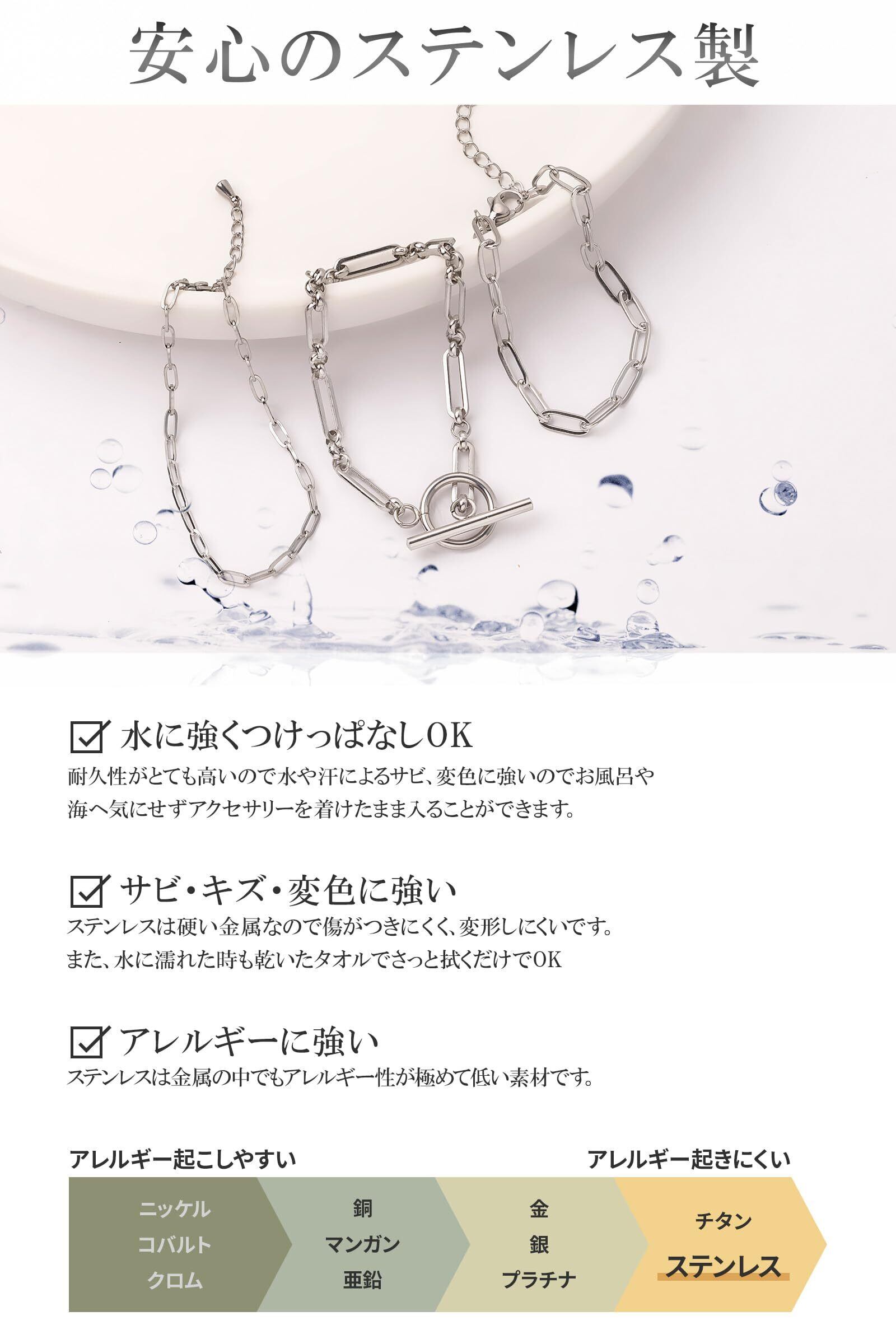 【金属アレルギー対応】 ステンレスは金属の中でもアレルギー性が極めて低い素材です。 【お風呂、海OK】 耐食性がとても高いので水や汗によるサビ、変色に強いのでお風呂や海へ気にせずアクセサリーを着けたまま入ることができます。 【お手入れ簡単】 ステンレスは硬い金属なので傷がつきにくく、変形しにくです。また水にぬれた時も乾いたタオルでさっと拭くだけでOK