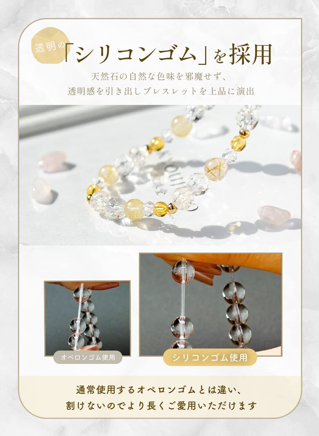 日常の生活で ブレスレット が避けたり、切れてしまう事がないよう丈夫な シリコンゴム を使用しておりますので、長くご愛用頂けます。さらに!シリコンゴムは 透明 ! 天然石 の自然な色味を邪魔せず、 ブレスレット を 上品 に演出します。