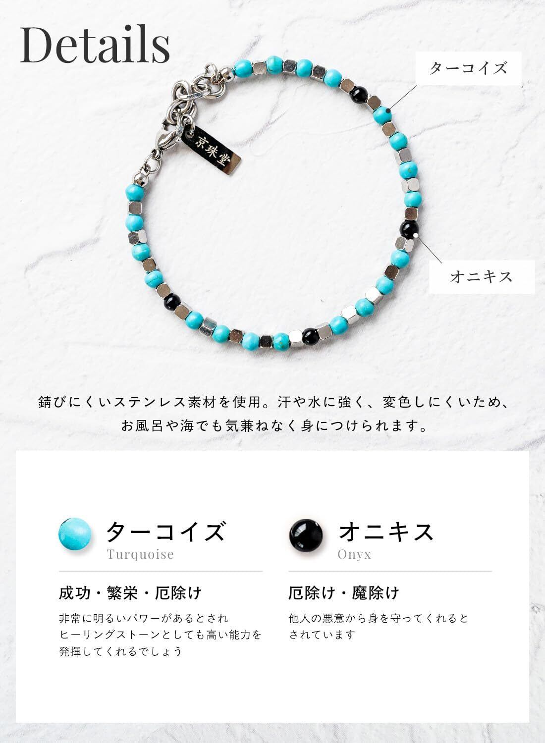 【新着商品】[京珠堂] 天然石 パワーストーン ブレスレット ターコイズ ステンレス ブレス メンズ レディース 成功 繁栄 厄除け 魔除け 幸運