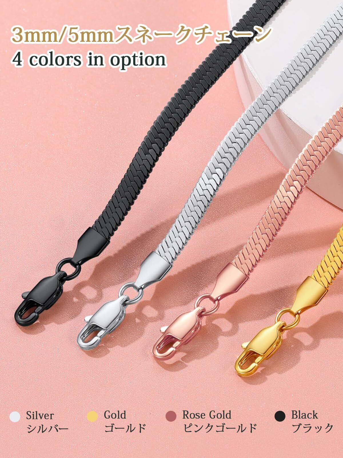 スネークチェーンアンクレット・ブレスレット:印象的な足首や手元に仕上げる、シンプルなスネークチェーンアンクレット・ブレスレットが登場。洗練された雰囲気の中に漂う大人っぽさ、主張しすぎなく、コーディネートに取り入れやすいです。こちらはシルバー、ゴールド、ブラックとピンクゴールドの人気4色、幅3mmと幅5mmのバリエーションからお選び頂けます。