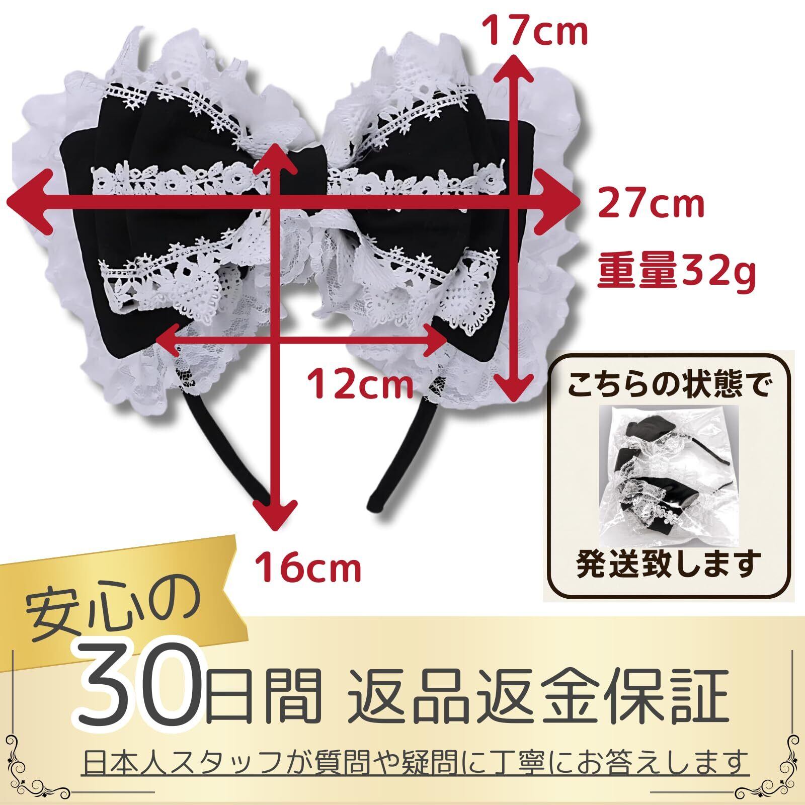 【リボン&レースの上品デザイン】 ヘッドドレスの大きな黒リボンと繊細なレースが華やかさを演出。存在感あるリボンがアクセントとなり、クラシカルから甘めのロリータファッションまで幅広くマッチします。 【ゴスロリ&地雷系にぴったり】 存在感のあるリボンカチューシャは、ゴスロリや地雷系コーデにも相性抜群。ブラックの髪飾りとしてメイド服やクリスマスのコスプレ衣装と合わせれば、より可愛らしく映えます。 【軽量で快適な着け心地】 軽量設計のカチューシャレディース仕様なので、一日中つけても疲れにくい。ヘッドドレスとして文化祭や撮影会などでも気軽に使用できます。 【幅広いシーンで活躍】 メイドカフェ風のコーデやクリスマスの仮装、ゴスロリ・ロリータファッションの仕上げアイテムに最適。特別な日の髪飾りとして、推し活やパーティー、イベントでも大活躍します。 【製品仕様】リボン長さ:27cm、カチューシャ高さ:17cm、カチューシャ幅:12cm、重量:32g、素材:レース、サテンリボン、ポリエステル 【ご注意】 実際の色は、モニターの明るさなどにより写真と若干異なる場合があります。海外製品のため商品の大きさに誤差がある場合があります。過剰な梱包を避け、環境に配慮した取り組みを行っております。