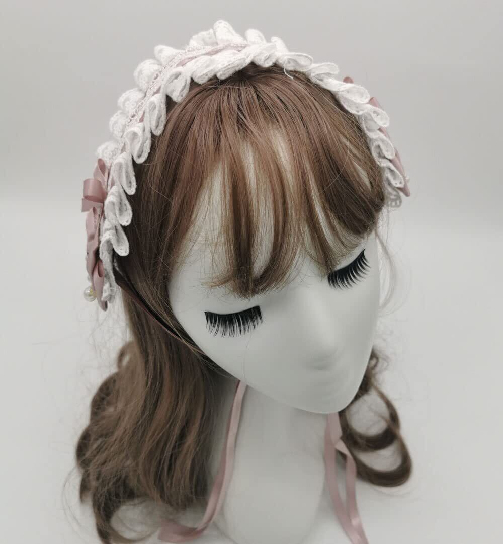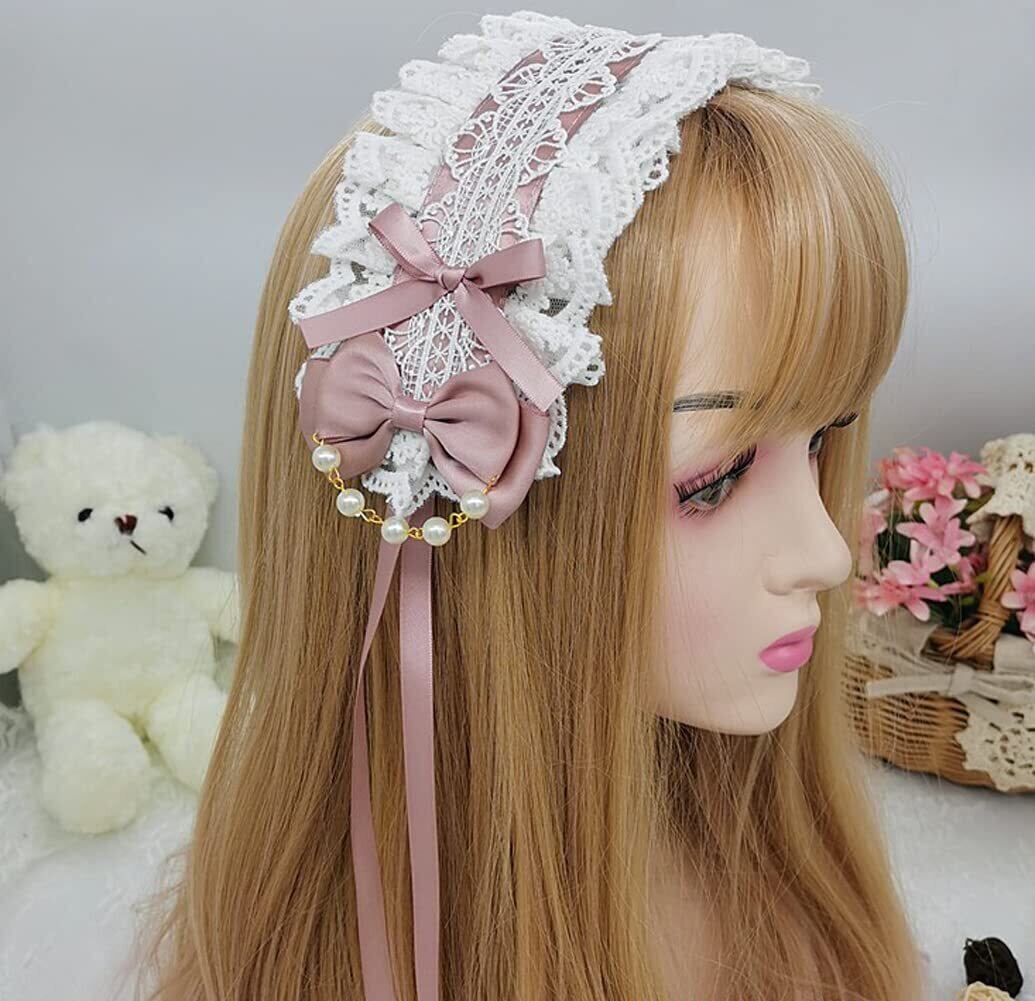 [通用] チャーム ロリータ 髪飾り リボン付き ヘアアクセサリー ビーズチェーン レースフリル カチューシャコスプレ系 萌え系 お人形 茶話会 パーティー メイドヘア lolita おしゃれ ゴスロリかわいい ヘッドドレス (霧のピンク Foggy pink)