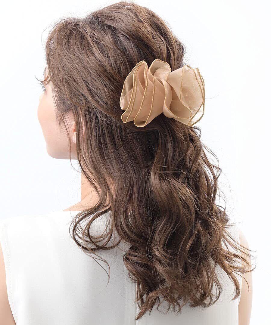 上品な透け感が楽しめるオーガンジー生地のフリルバナナバレッタ。ふんわりギャザーを寄せた華やかなデザインです。女性らしいスタイリングを日常に取り入れたい時や、結婚式・2次会など華やかなシーンにも映えるのでお勧めです。