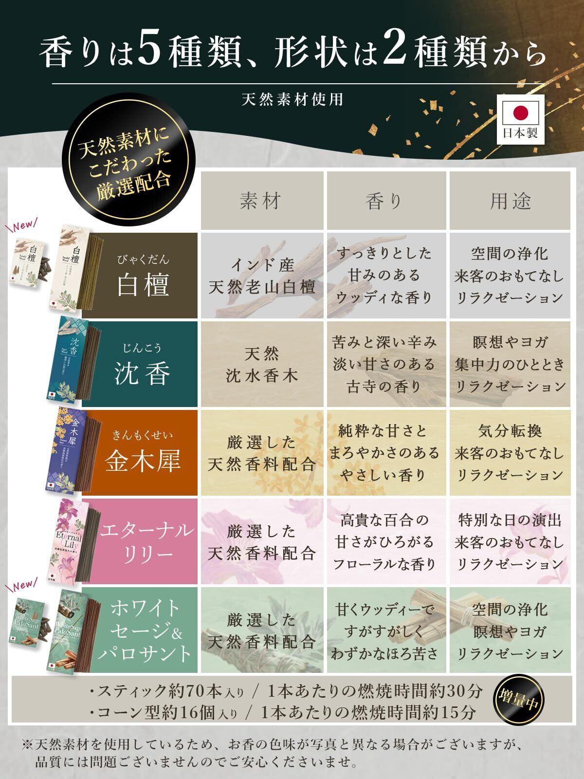 【最高級の老山白檀を贅沢に使用】 希少なインド・マイソール産の老山白檀を中心に、白檀・沈香・金木犀・エターナルリリーなど多彩な香りをご用意。スティック型・コーン型・サシェの3タイプから選べ、用途や気分に合わせてお楽しみいただけます。