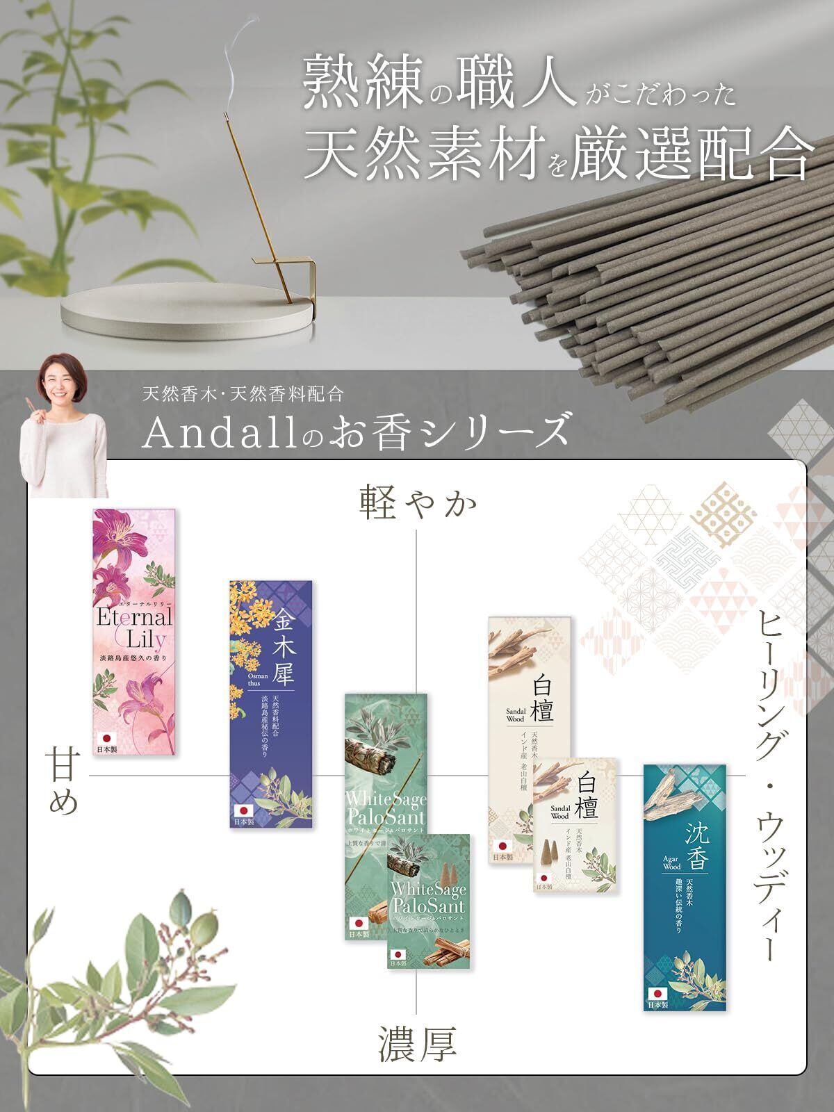 【人気商品】Andall お香 白檀 【香司の逸品 天然香料100% 】線香 最高級老山白檀 日本製 「上品な癒しの香り」 コーン 型 16個入 香木 ヨガ 瞑想 浄化 [アンダル] (白檀【コーン型】)