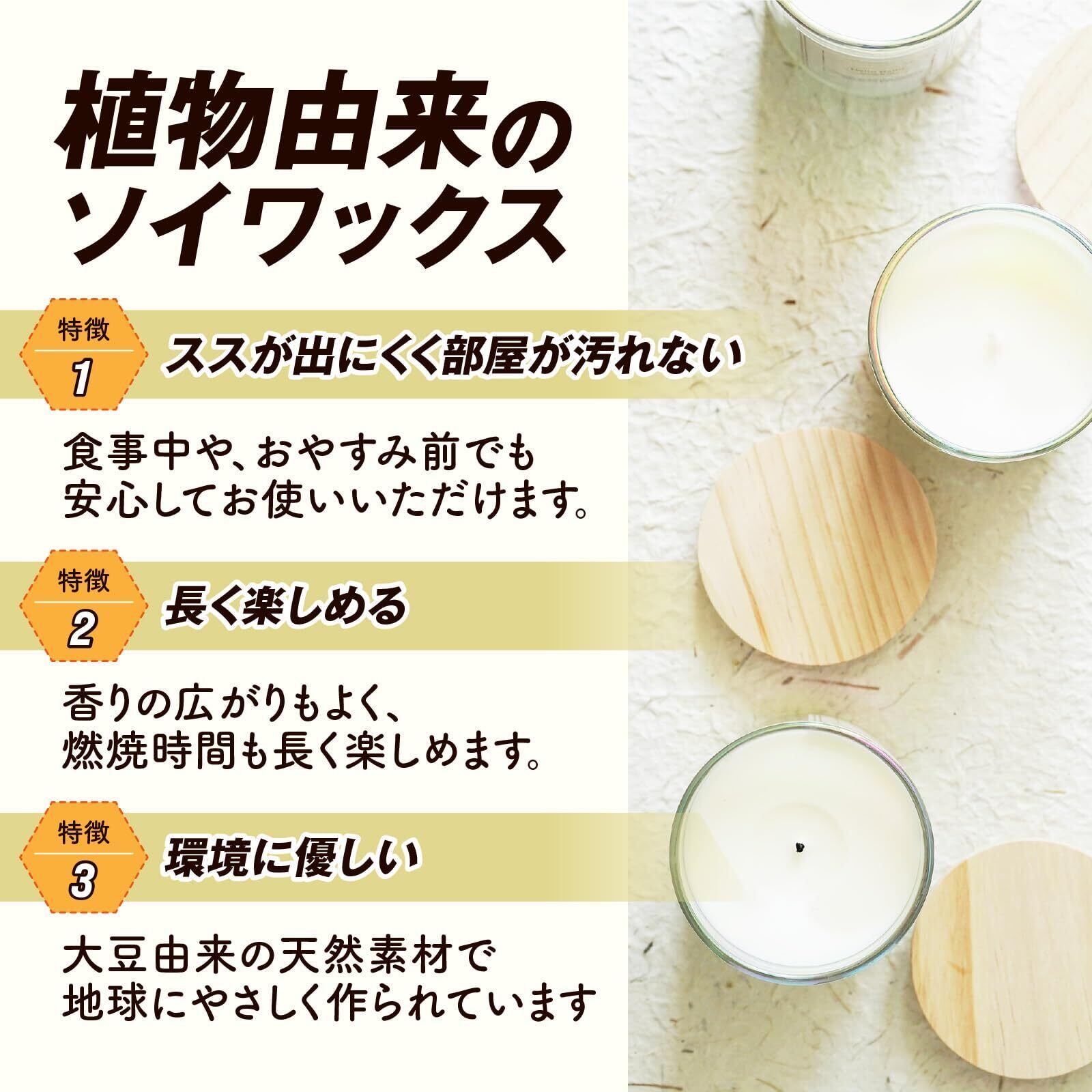 植物由来のソイワックス!ススが出にくく部屋が汚れないので、食事中や、おやすみ前でも安心してお使いいただけます!また石油由来のパラフィンワックスと比べ、香りの広がりもよく、燃焼時間も長く楽しめます。