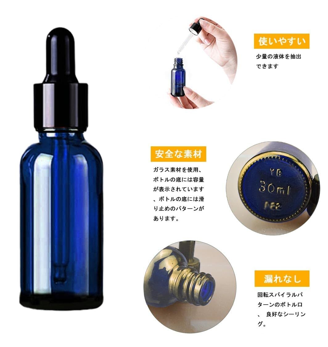 【液体の長期保存に適しています】遮光瓶はガラス製で、香水、エッセンシャルオイル、マッサージオイル、アルコールと化学反応して有害物質を発生させることは容易ではありません。同時に青いボトルは遮光性で、液体の劣化を防ぎます。