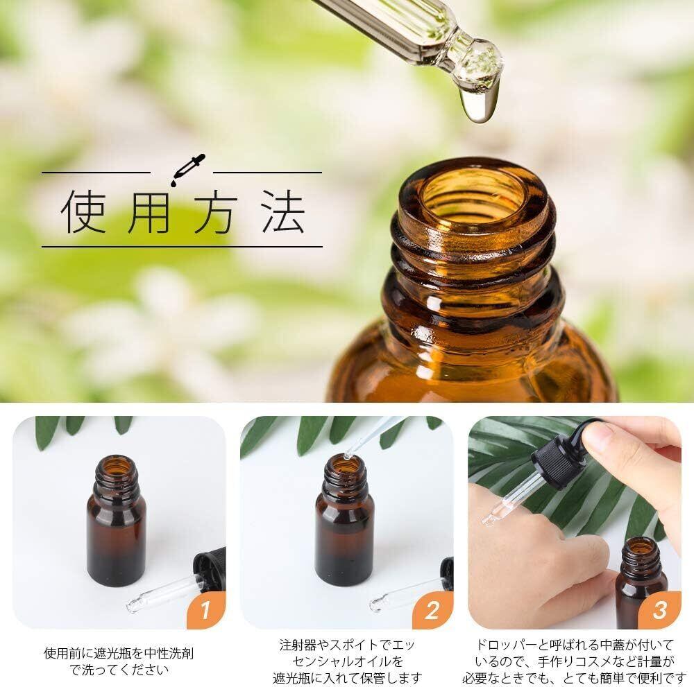 【ガラス製遮光瓶】:洗えば繰り返し利用できるガラス製遮光瓶です。ガラス製のため、通気性がない、他の材質よりもアロマオイル等を長く保ちます。煮沸消毒をすることも可能であり、清潔に使用することができます。
