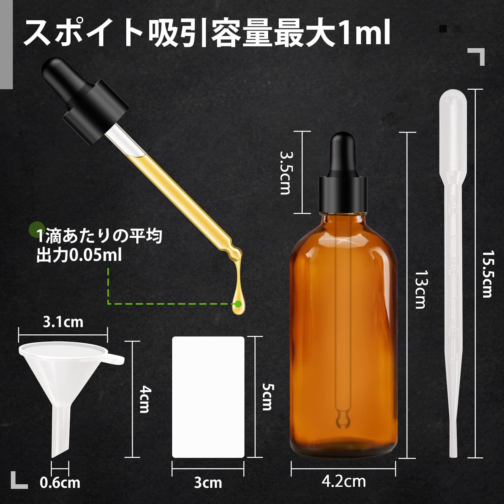 【携帯サイズ】幅4.4cm X高さ13.8cm。 正味ワイト:97グラム。 0.05mlの液体1スポイト。 ガラススポイトは最大1.5mlの液体を保持します。 理想的なトラベルサイズのボトル、キャップは盗難防止デザインです