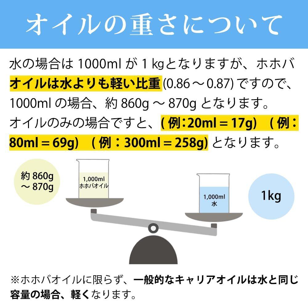 ■ホホバオイルは比重「0.86~0.87」により、300ml = 258g となりますので、総重量は約310g(容器+ポンプ含め)となります。