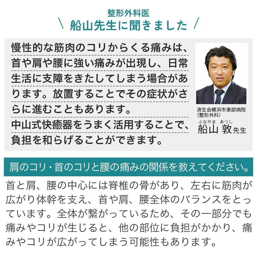 中山式快癒器は昭和22年に発売以来、半世紀以上に渡り愛され続けている当社のロングセラー商品です。快癒器の上に仰向けに寝て体重をかけるだけで、球頭が「あんま」「指圧」の働きを代用しコリをほぐします。