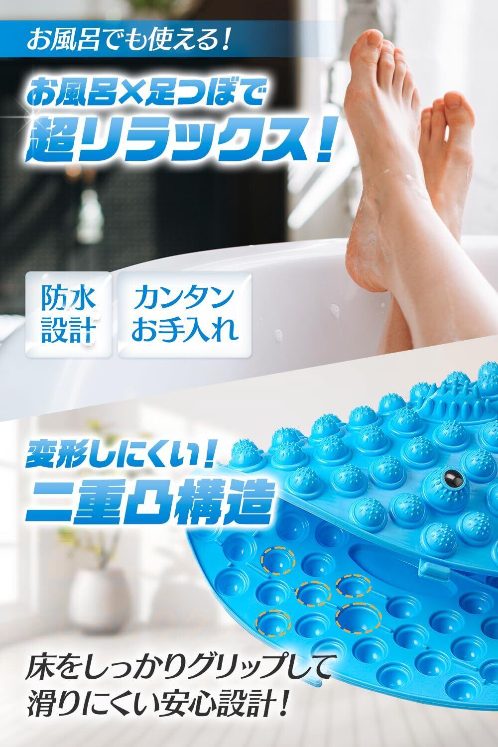 【 ボディケアのプロも注目!本格派の足ツボマット 】 「つぼリズム」は ボディケアのプロも注目する指圧ボード です。一般的な足ツボマットと違い、 足裏の様々なポイントに心地よい刺激を与えるよう設計しました。表面の突起は、まるで手のひらで押されているような心地よさを提供し、足裏全体をバランスよく刺激します。さらに、 耐久性の高い素材を使用 しており、長時間使用しても変形しにくい設計です。 日本企画の高品質な足ツボパッド だからこそ、安心して長く使えます。