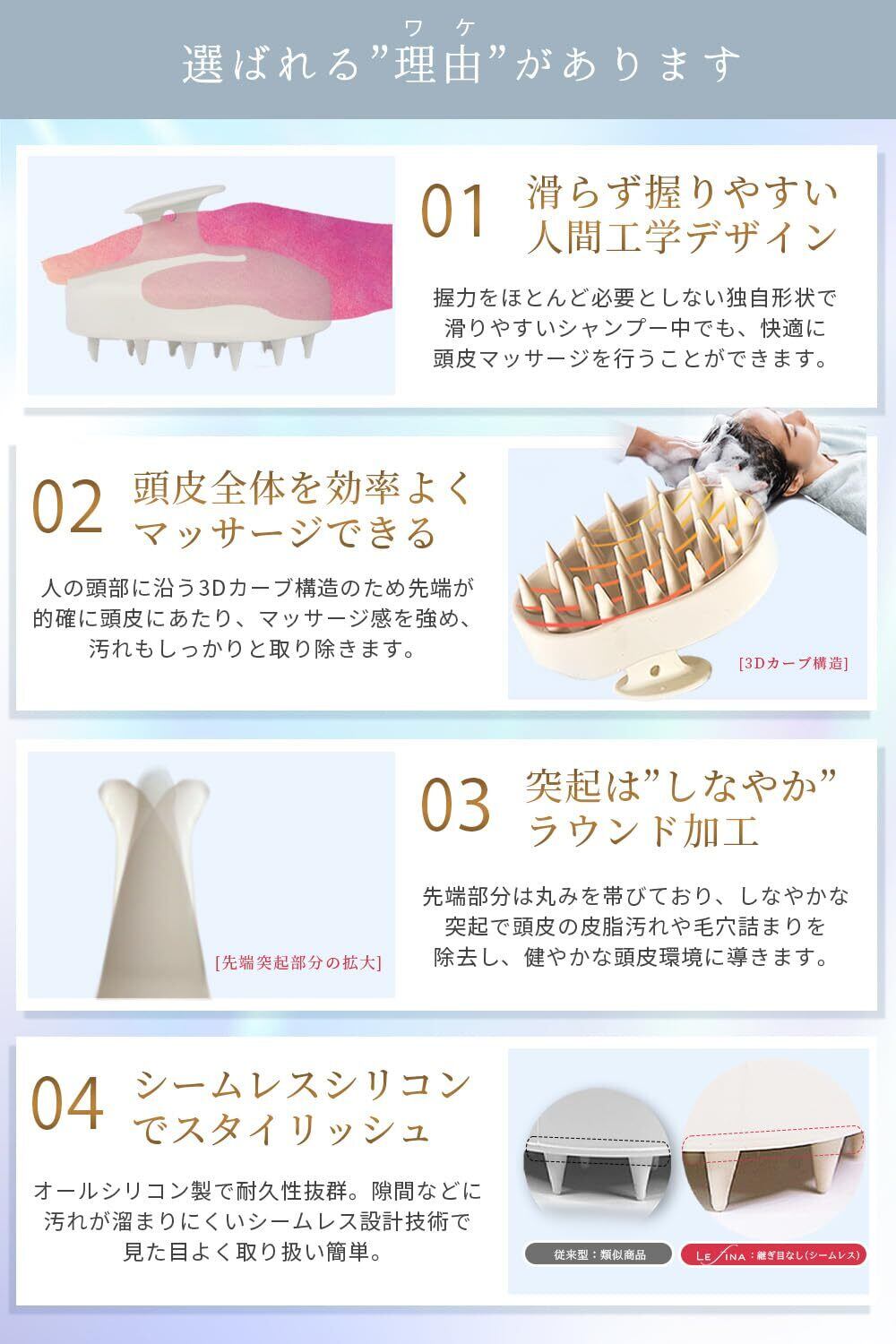 【人間工学に基づく設計】滑りやすいシャンプー中でも握力いらずで握りやすい「形」。内部は頭皮に沿う「3Dカーブ」形状でピッタリフィット。頭皮を傷つけない硬さを重視した突起で気持ち良いマッサージ感を得れます。
