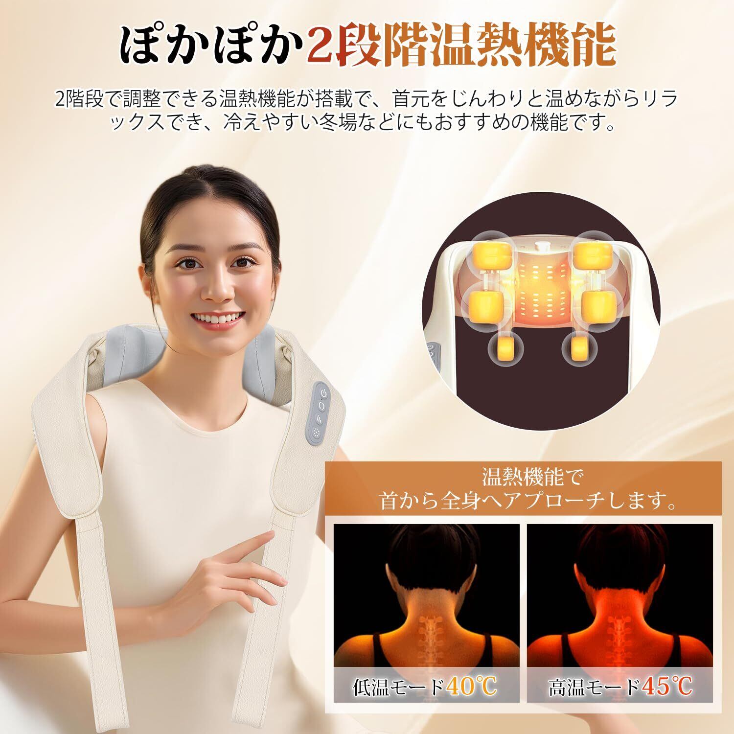 【2つの揉みモード&3段階強度調整&2段階温熱機能】ネックケアはプロの手技を模造し、独自の技術により2つの揉みモードが開発されました。また3段階強度調整が可能なので、ニーズによってモードと強度を選ぶことができます。お自宅にプロのサービスを体験できます。肩部のサポートは、2段階の温熱機能を搭載し、肩全体と首に温熱パックを施し、深くリラックスさせます。