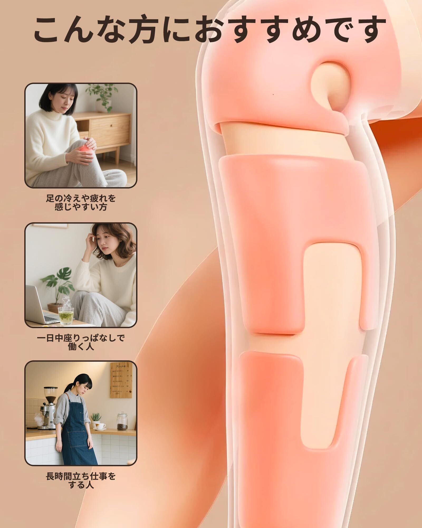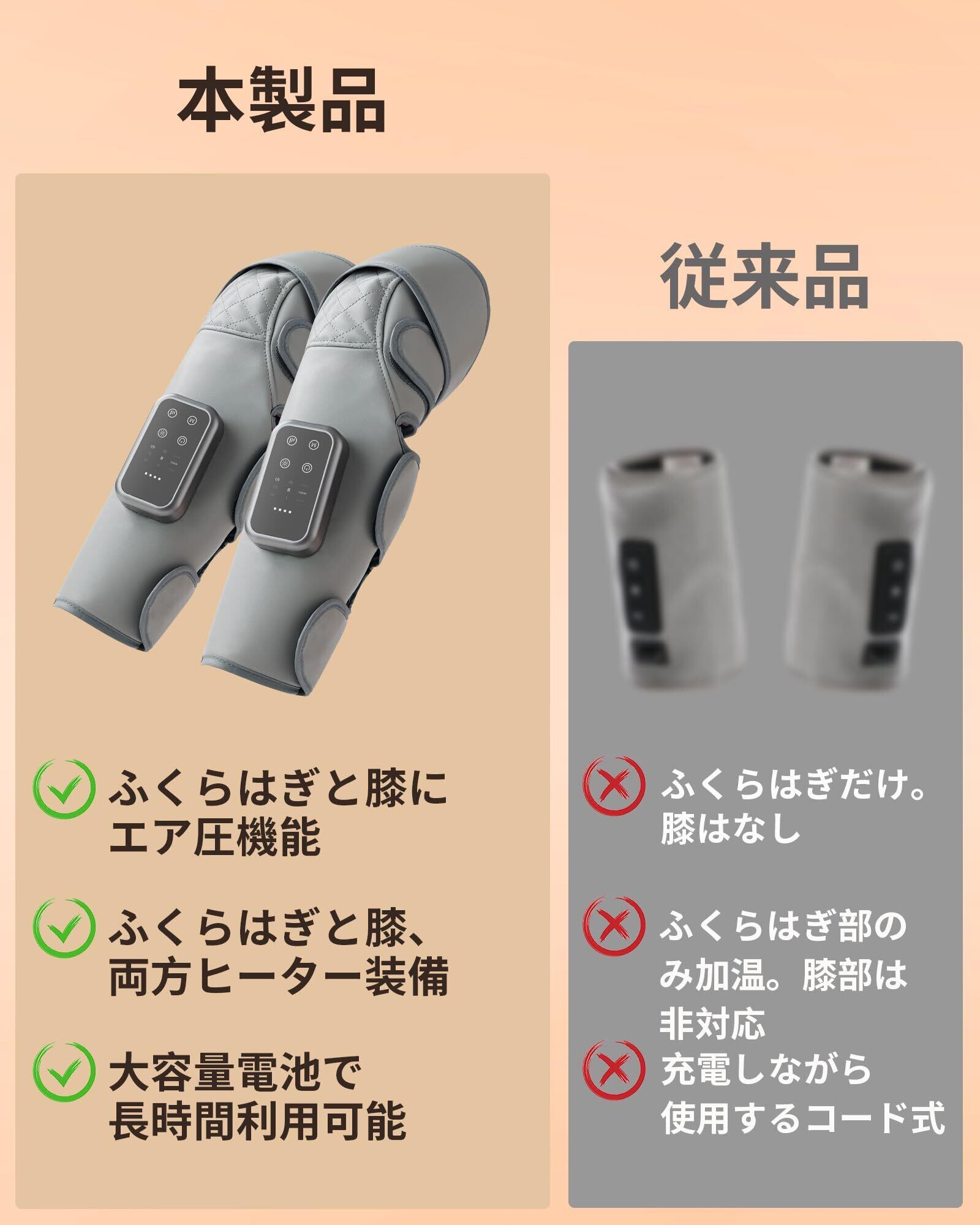 【ふくらはぎケアの新次元へ】従来の製品とは異なり、膝とふくらはぎの両方を広範囲に温めるダブル温熱パッドを採用。寒い季節には、膝からふくらはぎまでぽかぽかと温まり、深くくつろげます。さらに、2500mAhの大容量バッテリーとUSB充電式により、電源プラグに縛られることなく、いつでもどこでも手軽にご利用いただけます。