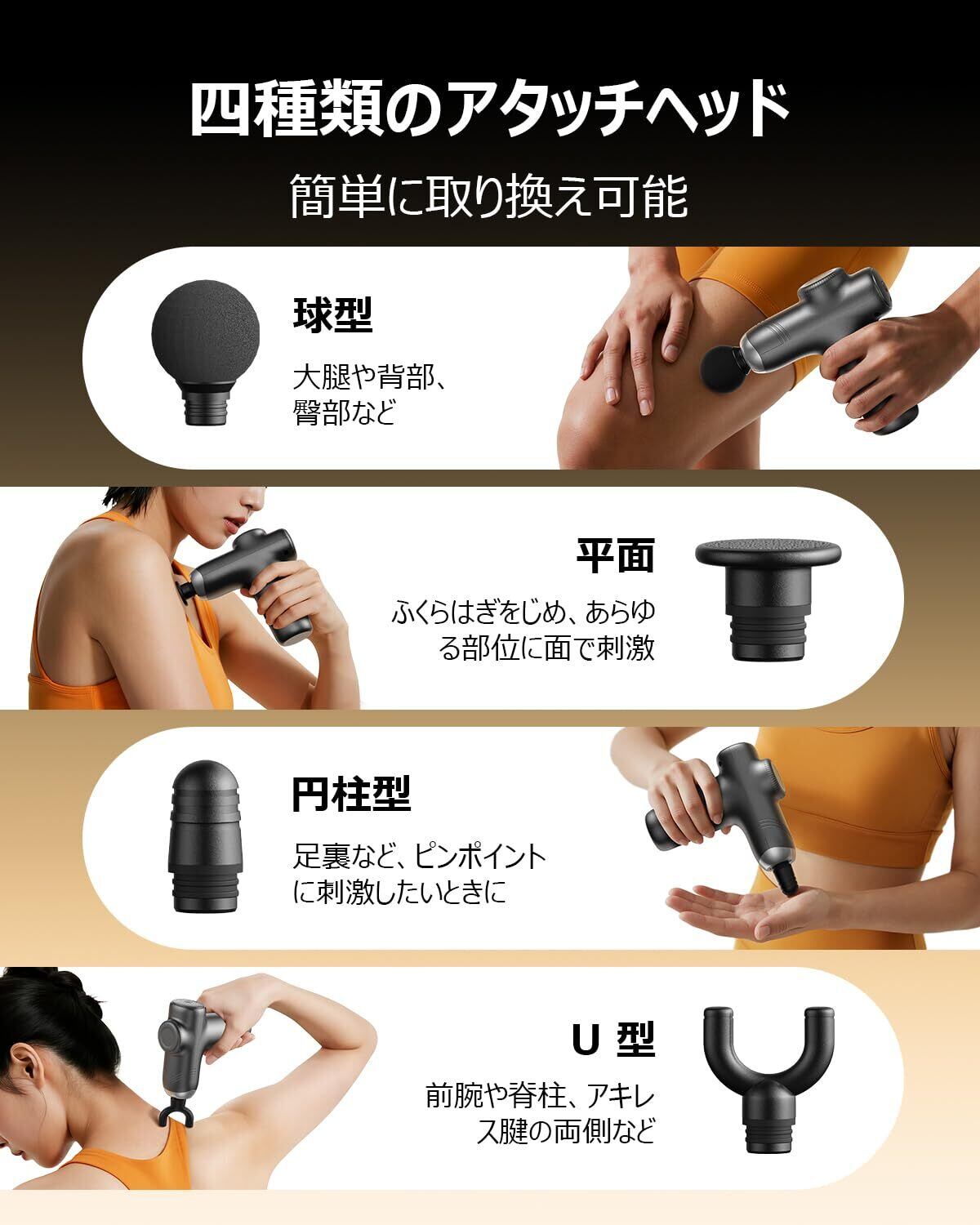 【4 種類の筋膜リリースヘッド&ワンタッチ操作】Aobbowは環境に優しい素材を使用した4種類のヘッドを標準装備し、ニーズに応じて球型、U 型、円柱型、平面型のアタッチメントに交換可能です。どの部位にも合ったアタッチメントを見つけることができます。そして、ハンドルの上面にボタンを 1 つ装備し、ワンボタン操作ですべての機能を簡単に制御できます。