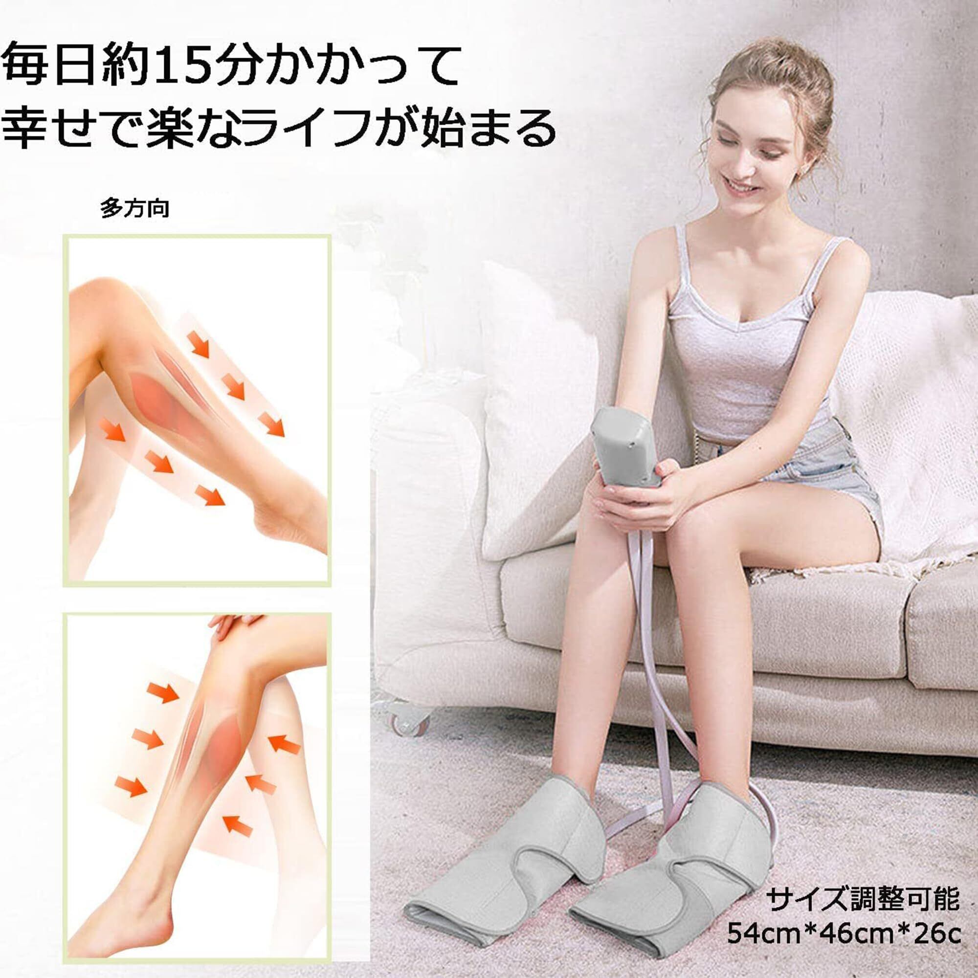 【3段階強度&3モード】フットケア方や狙い部位により、加圧強度は 弱、中、強三つのランクがあって、調節できます。また、エアー加圧方式によって、三つのモードがあり、ぎゅっと上げ、収缩ほぐし、ソフト脚部メインをご用意、お好みの最適な加圧モードを選んでください。複数のエアバッグが順番に繰り返し押し揉みをします。