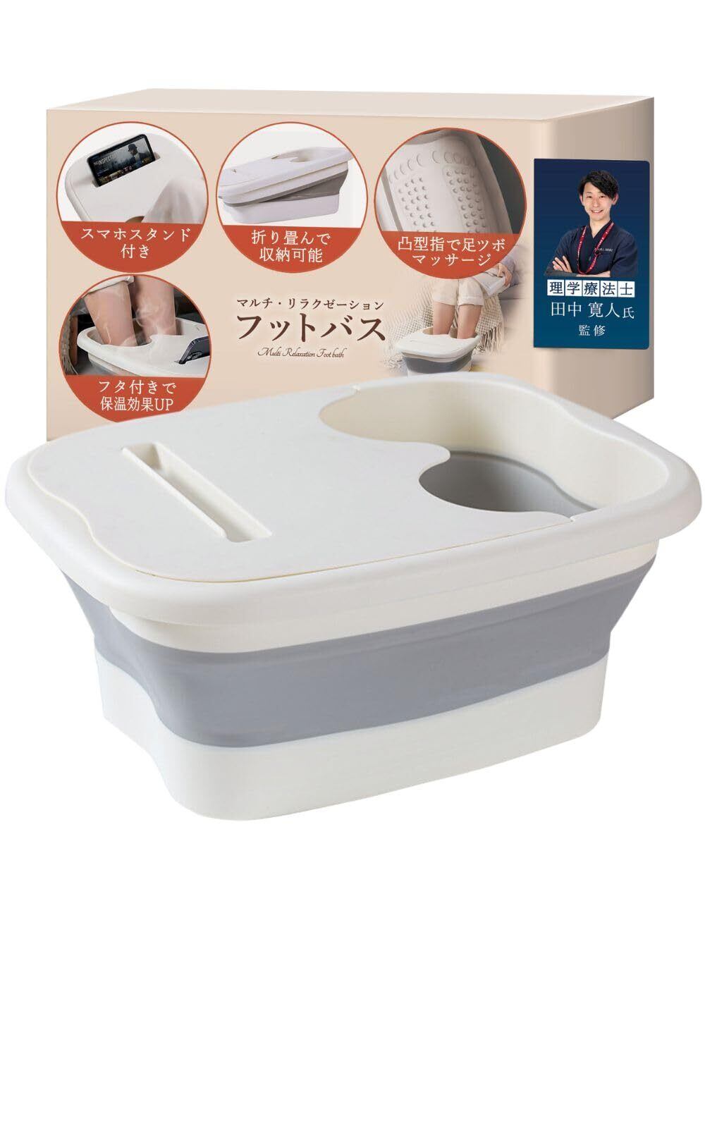 フットバス 【理学療法士監修】 足湯 バケツ 桶 折りたたみ 蓋付き【携帯電話を置ける便利なフタ付きデザイン】 足浴 足湯器 泡脚桶 折り畳み 折畳み 保温 温活 介護 足つぼマッサージ 収納 (ホワイト)