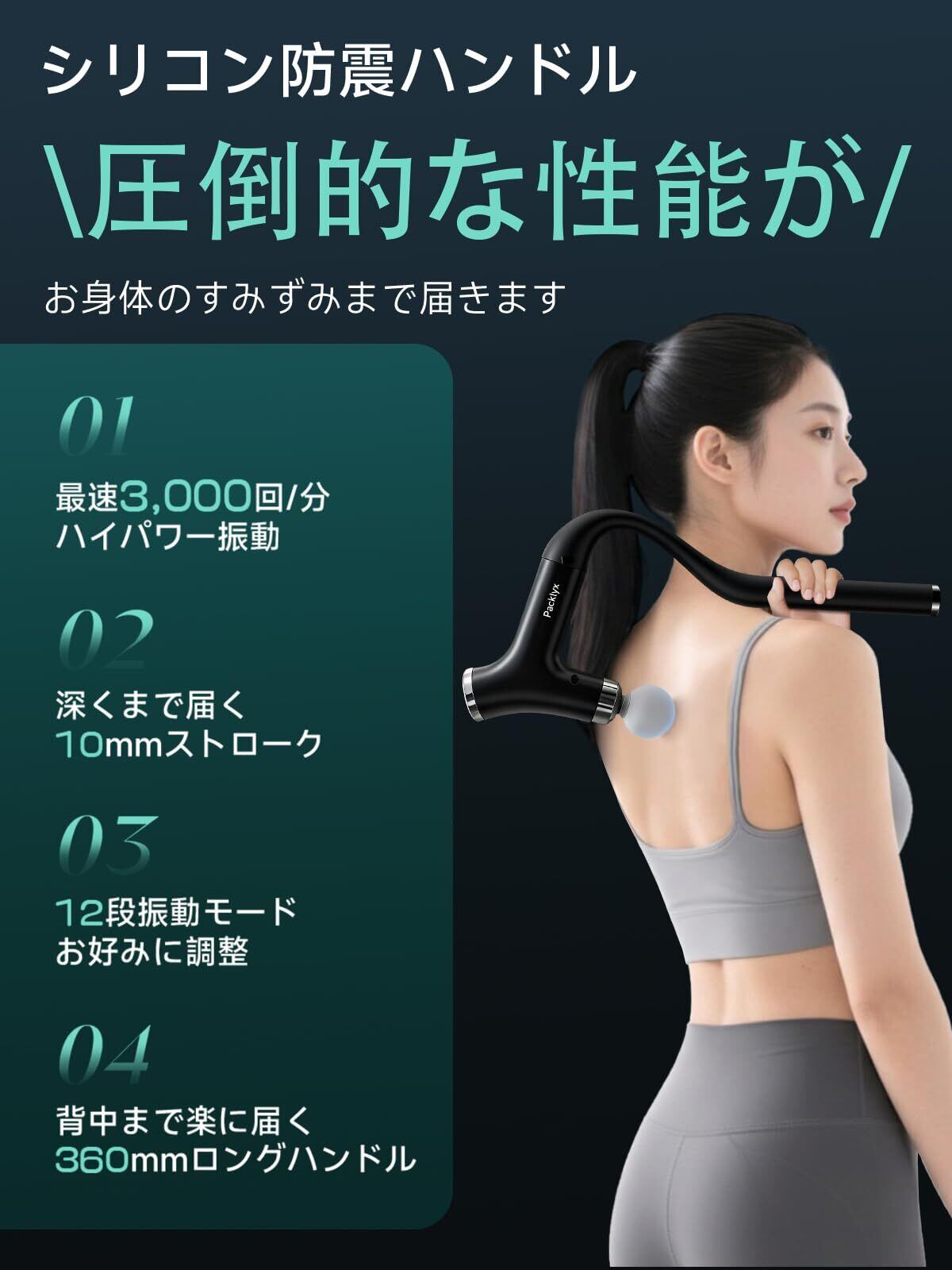 筋膜リリースガン ハンディガン【延長設計・背中まで届く】12段階強力振動 10mm振幅 3000mAh大容量バッテリー Type-C急速充電対応 4種類ヘッド付属 全身リフレッシュ 筋膜ガン 男女兼用 日本語説明書付き ギフト最適 ブラック