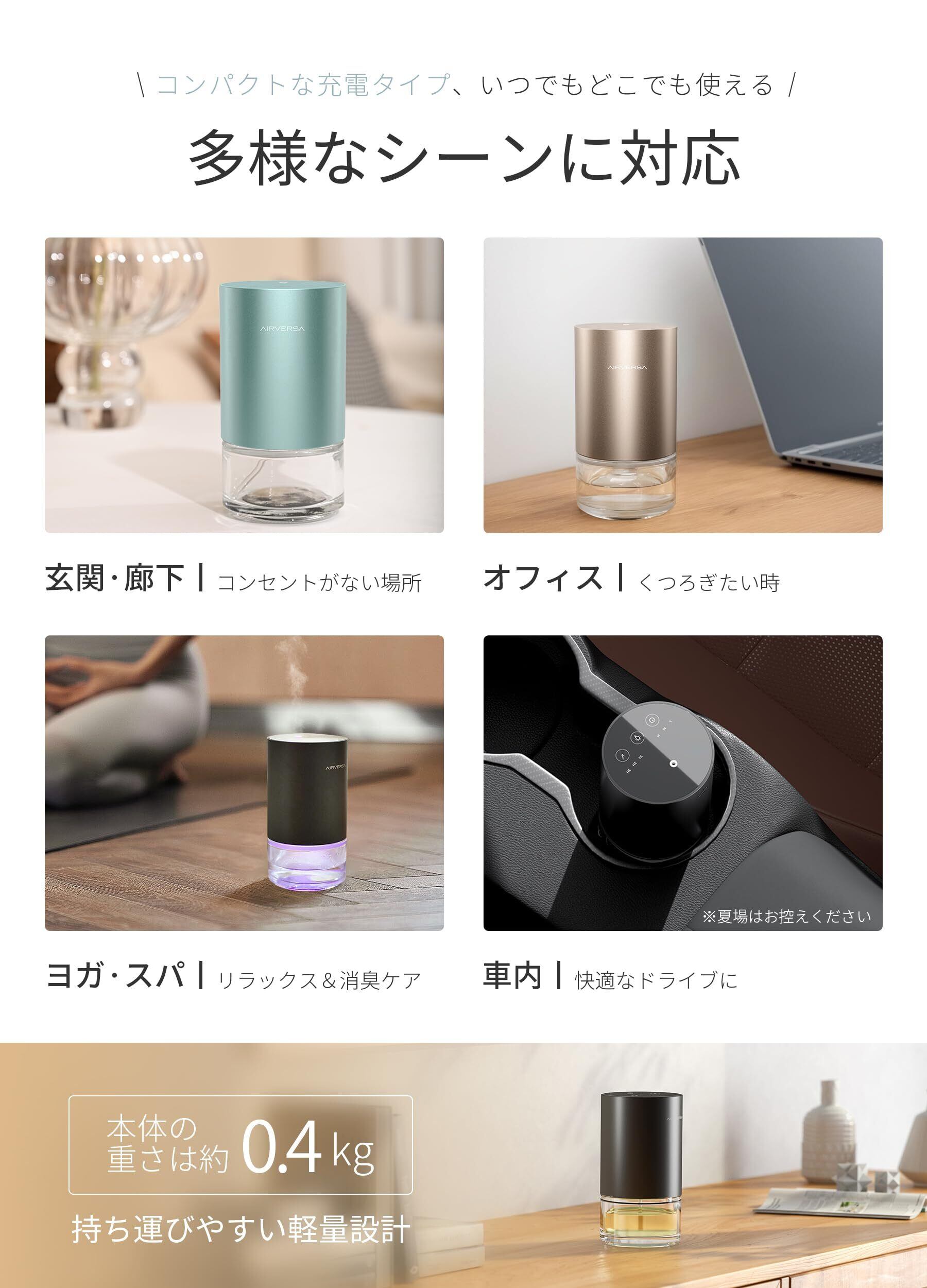 Airversa エッセンシャルオイルディフューザー 水なし 100mL バッテリー駆動 小型 カーディフューザー 寝室・オフィス・デスク 家庭用大部屋対応 ネブライザー技術 アロマセラピー、AN2(ブラック)
