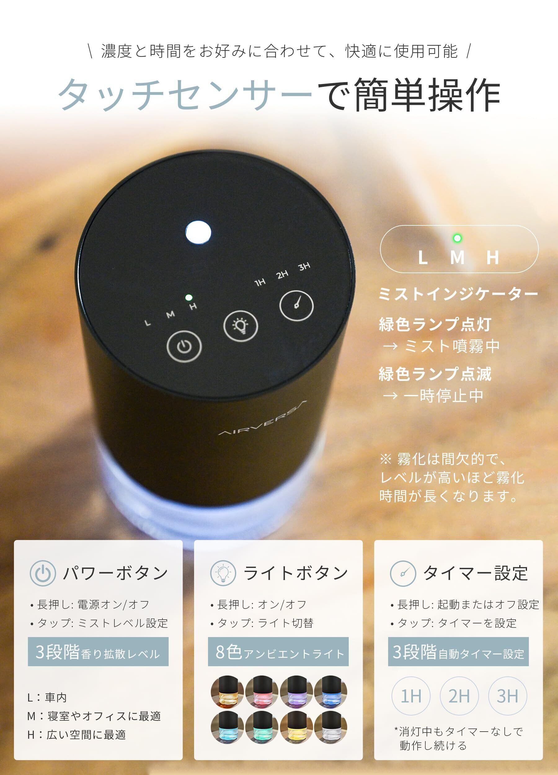 【ウォーターレスエッセンシャルオイルディフューザー】取得済みのウォーターレス拡散技術を活用し、お好きなエッセンシャルオイルを加熱や水を使わずに「ナノミスト」に直接変換します。従来の超音波ディフューザーと比較して、このデザインはより革新的で、使いやすく、安全です