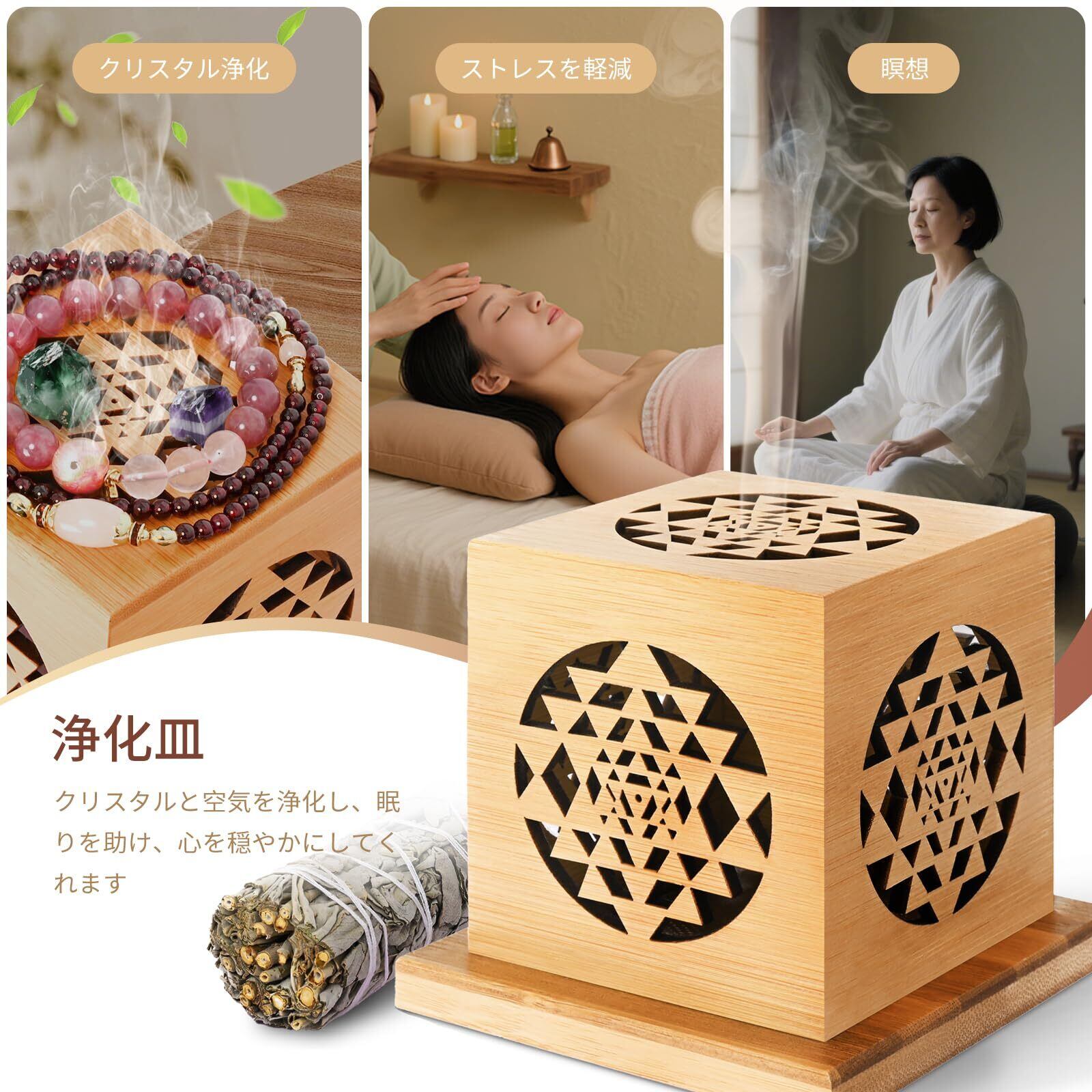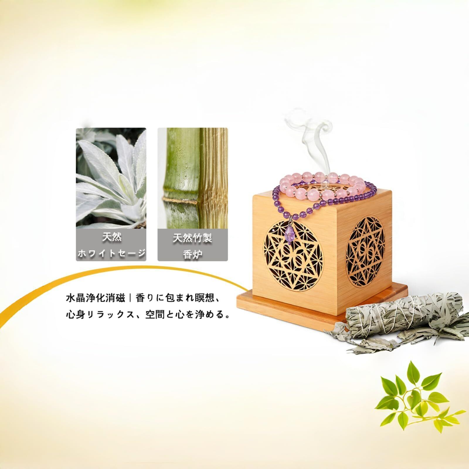 【在庫セール】ホワイトセージ 天然枝 浄化用 セット【無農薬 35g + 竹製 彫刻透かしお香立て おしゃれ】バレンタインギフト お香炉 パワーストーン 宝石 クリスタル対応 横置き 灰漏れなし コーン/長香/渦巻き香対応 万能設計 (生命の花) インテリア 癒し リラックス 贈り物に最適