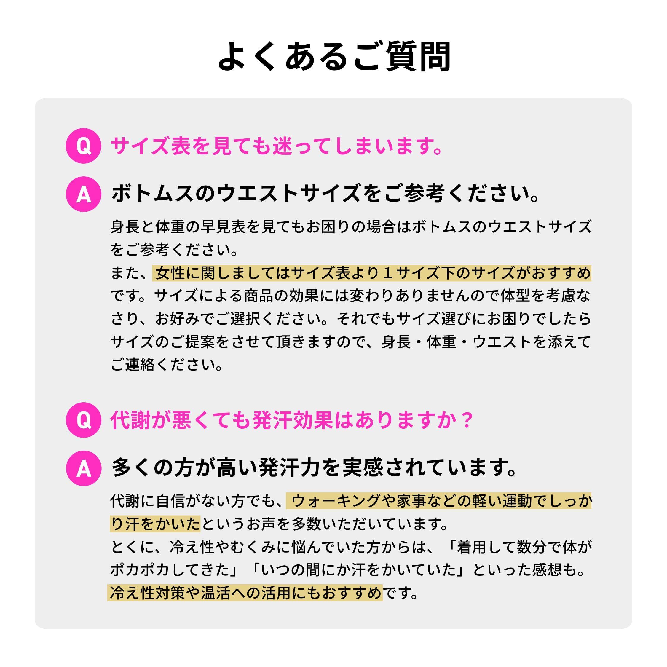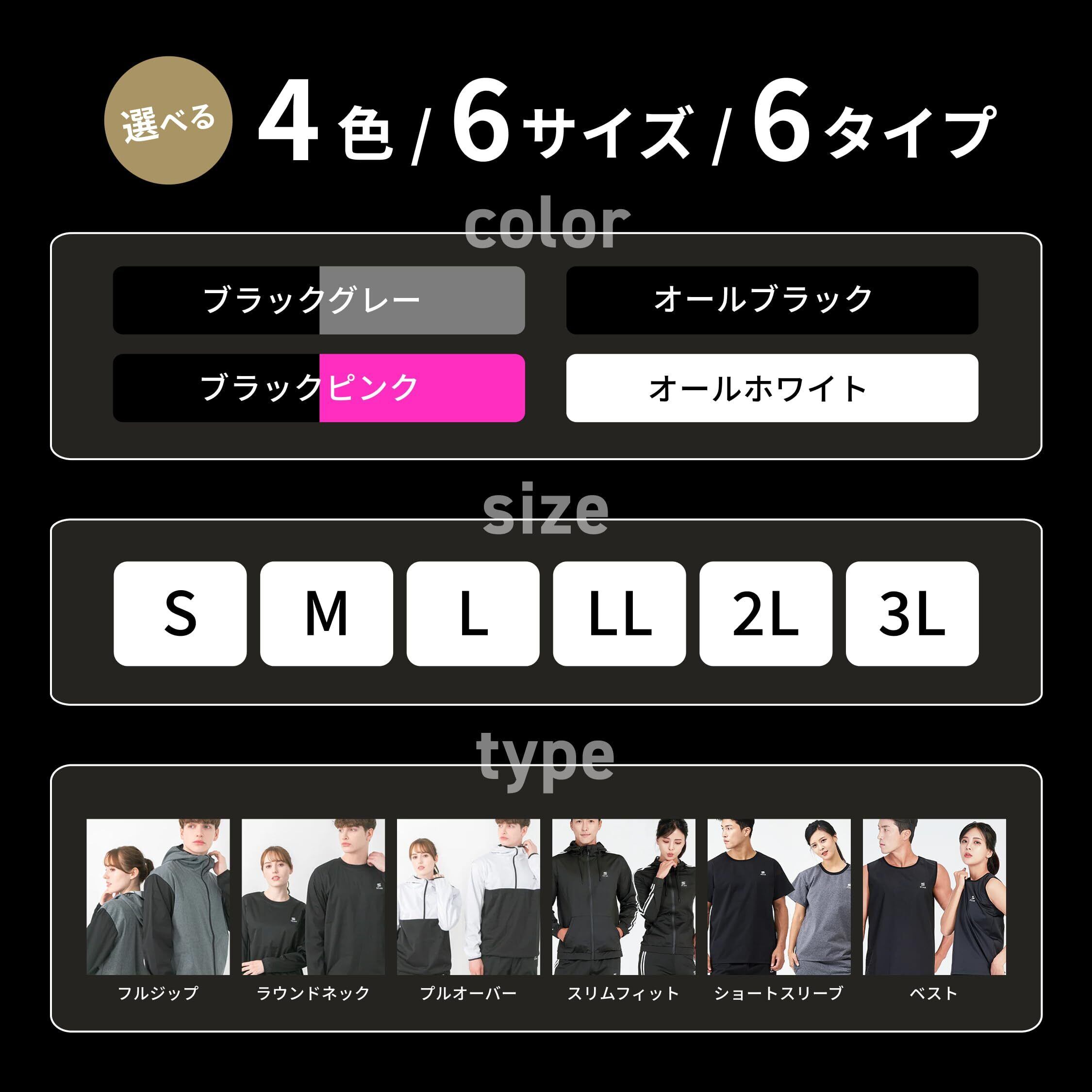 【 特殊素材による強力な発汗力 】薄い発泡ポリウレタン製素材をウェアの内側に接着加工した生地によってあなたの発汗をしっかりと促します。運動中の発汗を促すことで身体に溜まった余計な水分や内臓器官を通じて老廃物を排出することができ、基礎代謝を高める効果が期待できます。また、日常でも基礎代謝が上がるため、汗をかきにくい人、減量したい人、運動でストレスの発散をしたい人、気持ちのいい汗をかきたい人にもオススメです。素材も銀ナノコーティングにより抗臭機能も備えた生地なので、汗の嫌な臭いをおさえ快適にお使い頂けます。
