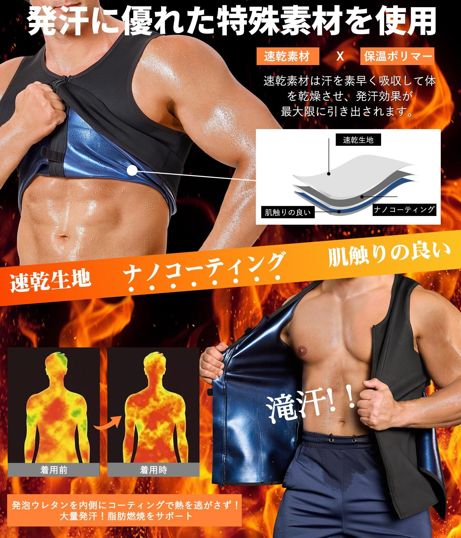 1. 【効率的な発汗素材】 このサウナスーツ メンズは、特殊なコーティング素材を使用して、短時間で体温を上昇させ、運動中の発汗を促進します。家庭用サウナとしても使用でき、脂肪燃焼をサポートし、お腹の脂肪を効率的に落とします。日常の運動やエクササイズに最適です。