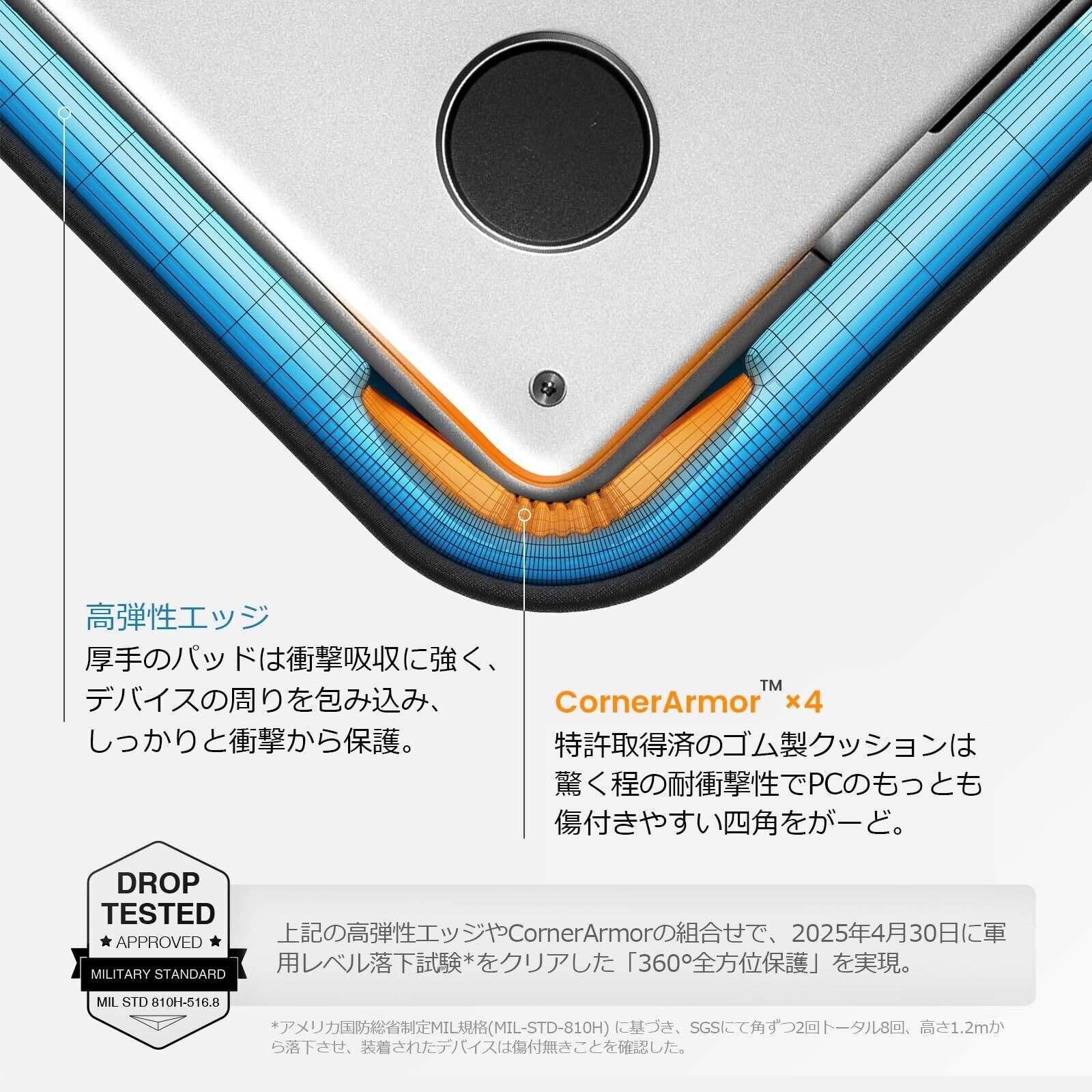 【軍用規格の360°全面保護】このパソコンバッグは四角にある取得のゴム「CornerArmor」クッション、PC四辺をフル周る厚手の高弾性エッジやふわふわとした裏生地の組合せが、超強耐衝撃力でパソコンを衝撃や意外の落下から守り、アメリカ軍用落下規格(規格MIL-STD-810H:2025)をクリア。