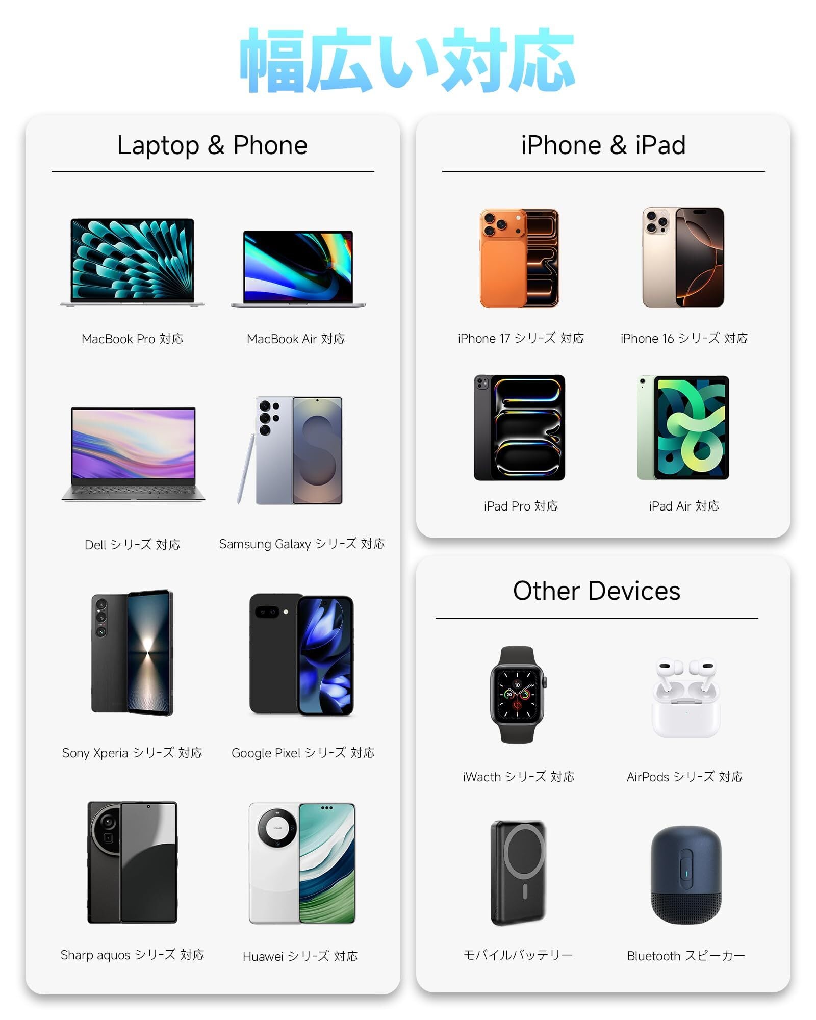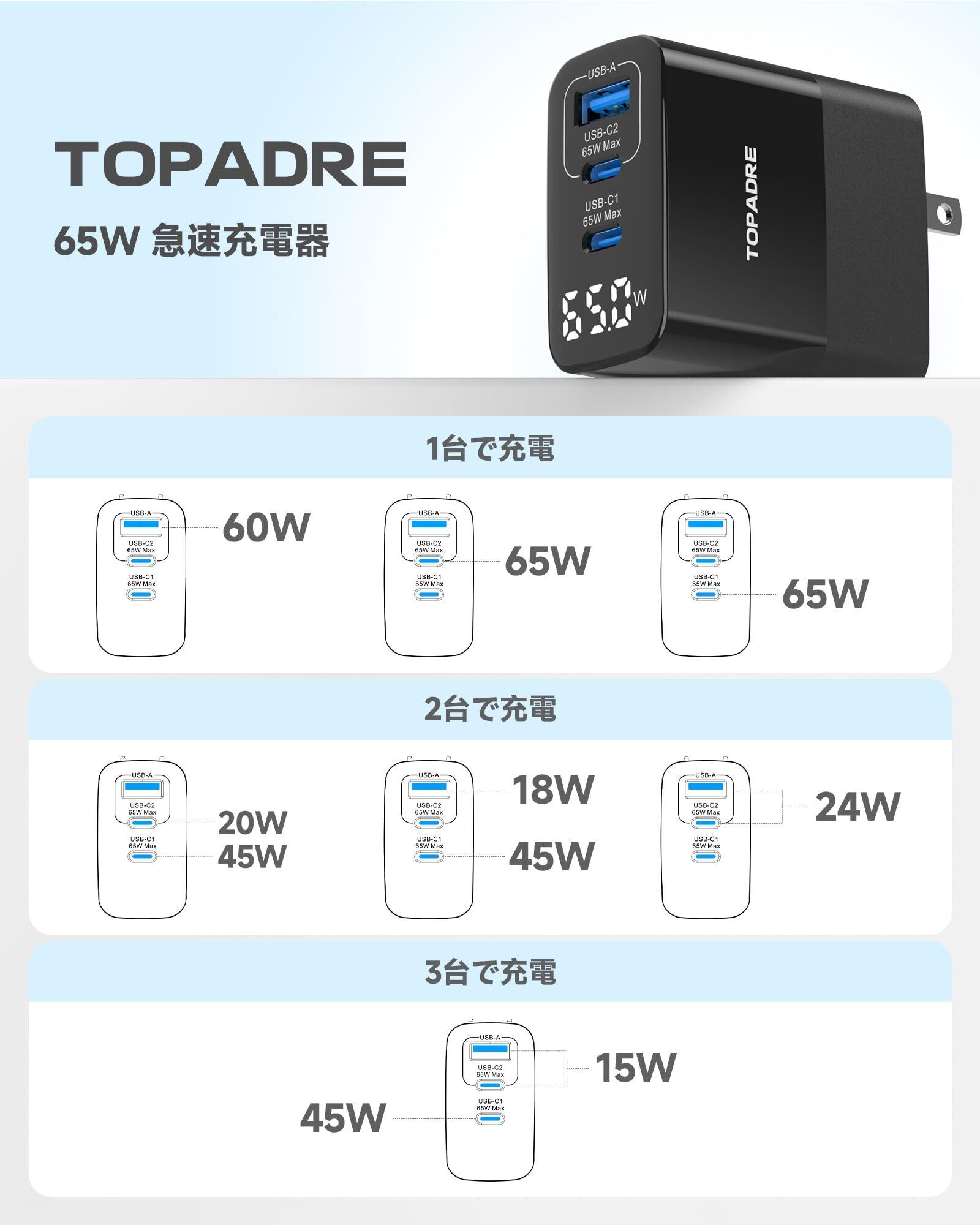 【3 IN 1 PD 充電器 65W】外出前や緊急時にバッテリー切れ?そんな時こそ、のPD 充電器 USB-Cが大活躍します!安価でPDに対応していないusb c 充電器とは異なり、の65W 充電器は Power Delivery (PD)およびQuick Charge (QC)技術を採用し、30分でMacBook Air M2を0〜50%まで充電可能で、フル充電時間を40分以上短縮し、毎日1時間以上の時間を節約できます。外出や忙しい生活の中で充電待ちの時間を大幅に短縮し、充電のストレスから解放され、日常生活がより快適になります!さらに、本製品の充電器 type-cはType-Cポート*65W Maxを2つ、USB-Aポート*60W Maxを1つ搭載し、3台のデバイスを同時充電に対応。まさに、pd 充電器 65w を1台持つことは、パソコン用+携帯電話用+小型機器用のacアダプターを1台持つことに相当し、テンポの良い充電ライフを実現します。旅行でも自宅でも、この1台で十分です!※コンピュータデバイスを充電する必要がある場合は、Cポートを使用することをお勧めします。