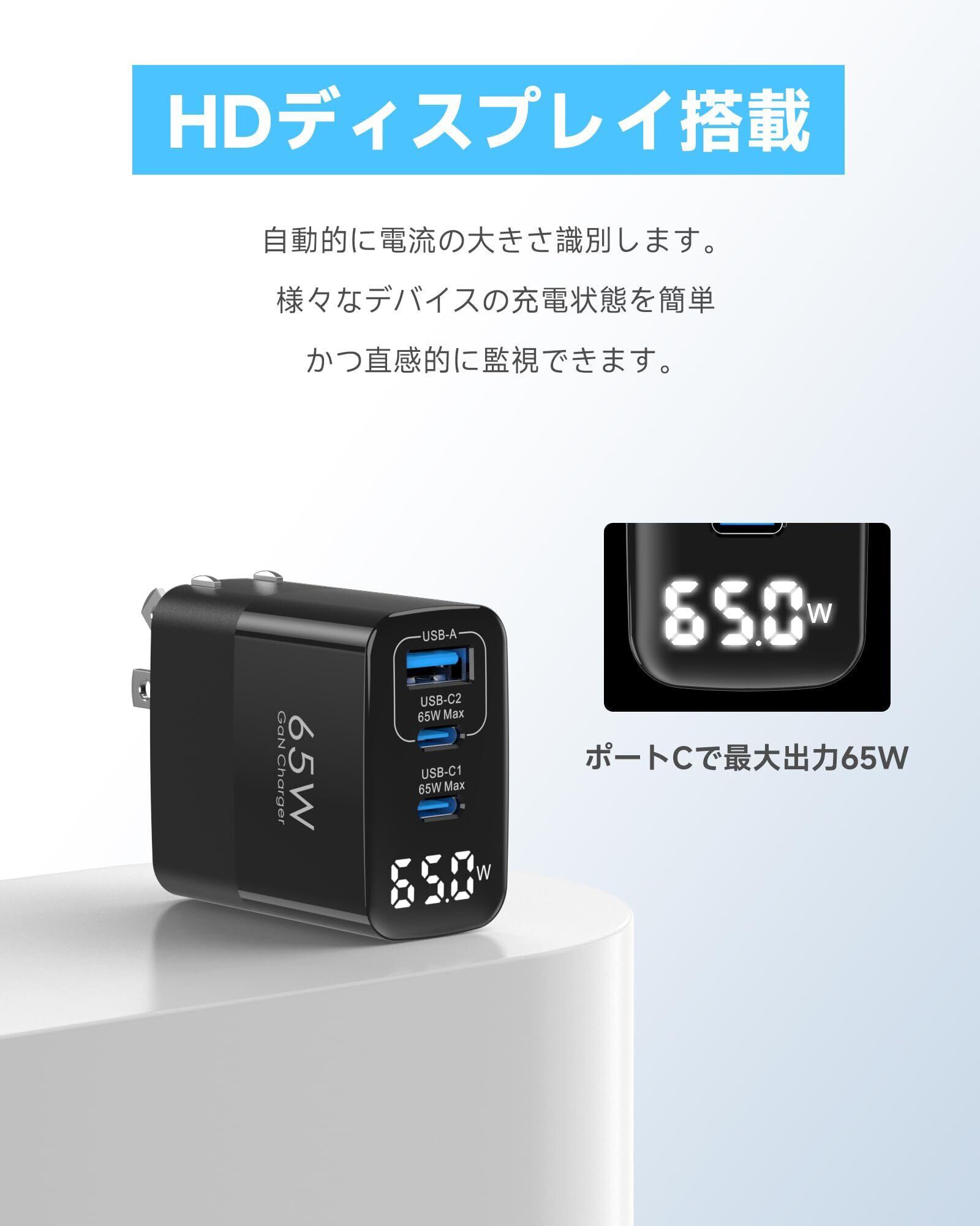 65W 充電器 type-c【LEDディスプレイ搭載·折りたたみ式プラグ·軽量·GaNIII技術·三台同時充電】 PD 充電器 USB-C×2 & USB-A 携帯タイプc充 電器 ノートPC用 ACアダプター PD3.0/QC4.1/PPS 規格対応 コンパクト MacBook/Surface/iPad/iPhone/Samsungなど/Android機種対応 出張·旅行 黒色