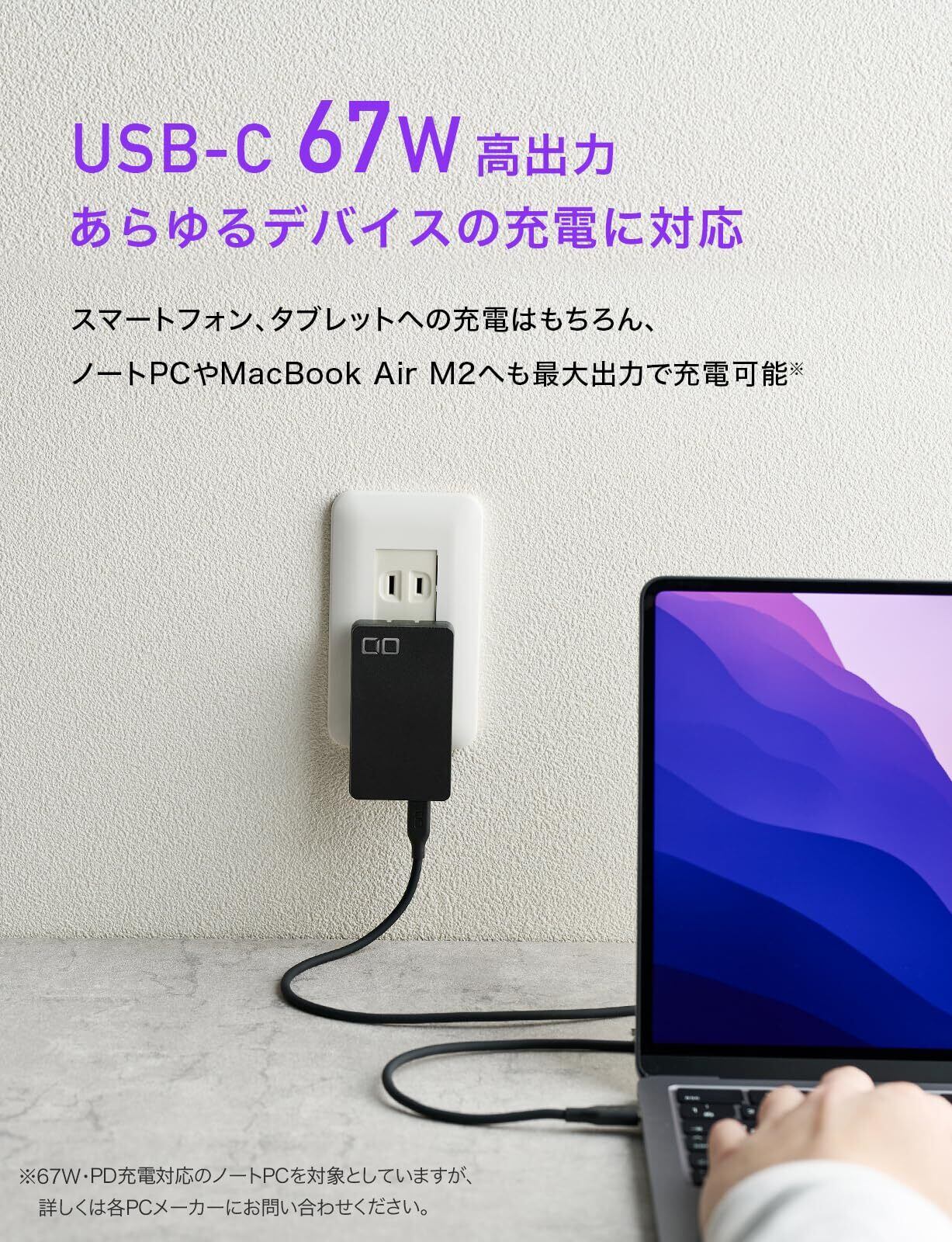 【単ポート最大67W出力】USB-C単ポート最大出力67Wでノートパソコンへの充電に適した充電器です。 スマートフォン(iPhoneやGalaxy、Xperia等のAndroidスマホ)からタブレット(iPad / iPad mini / iPad Pro)、ノートPC(Macbook / Macbook Air / Macbook Pro、LenovoやHP、他あらゆるWindows PC等)、ゲーム機(Switch等)まで幅広い機器に対応しています。