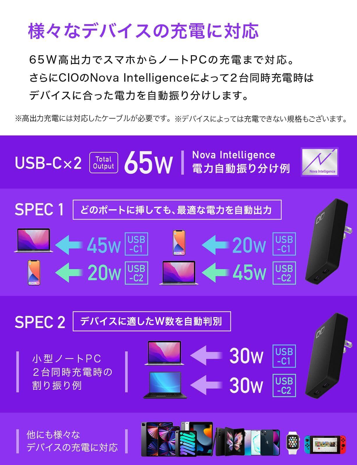 CIO NovaPort SLIM DUO 65W 2C [極薄 14mm CIO独自技術 NovaIntelligence搭載] PD GaN 高出力 2ポート Type-C 小型 急速充電器 タイプc USB 同時充電 iPhone 17 / Air / 16 / 15 Android Macbook iPad ノートPC (ブラック)