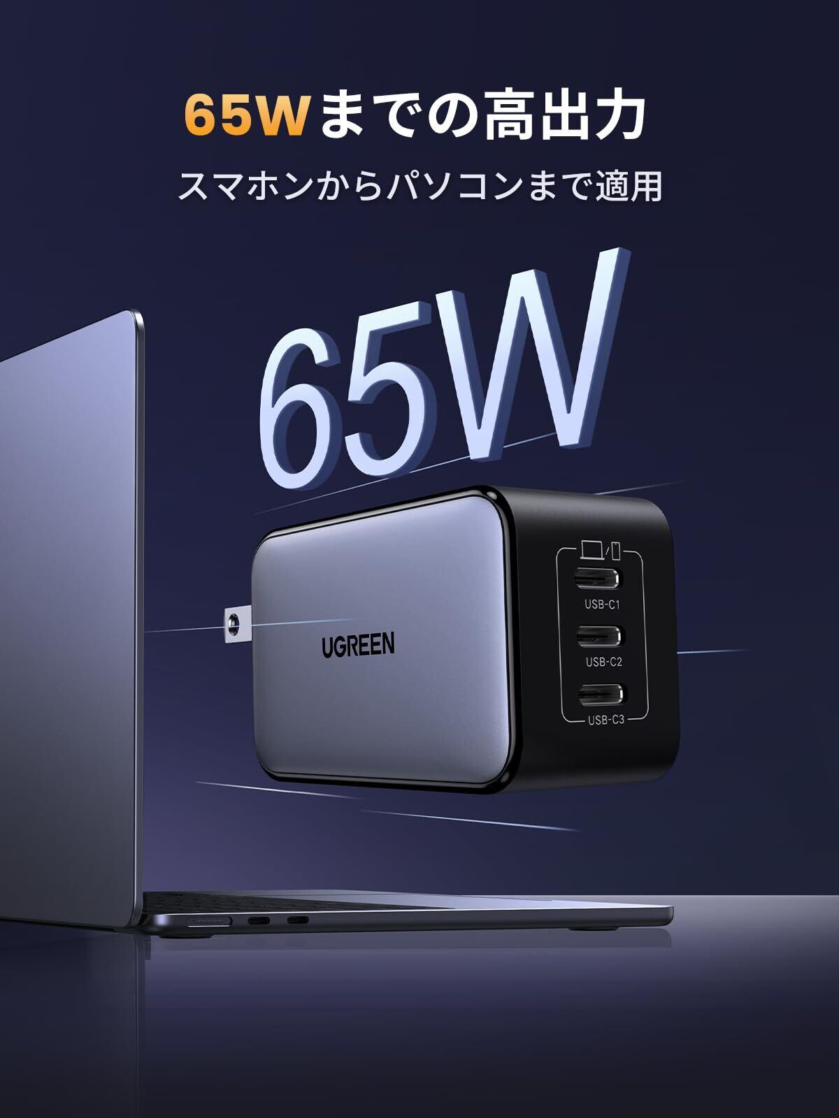【3つタイプCポート付き】UGREENのタイプC充電器はType-Cポートを3つ搭載して、3台のデバイスを同時充電に対応。65Wの出力パワーはパソコンから携帯までの全てのUSB-Cデバイスに充電可能で旅行でも自家用でもこの一つで十分(単ポートも65W対応) .
