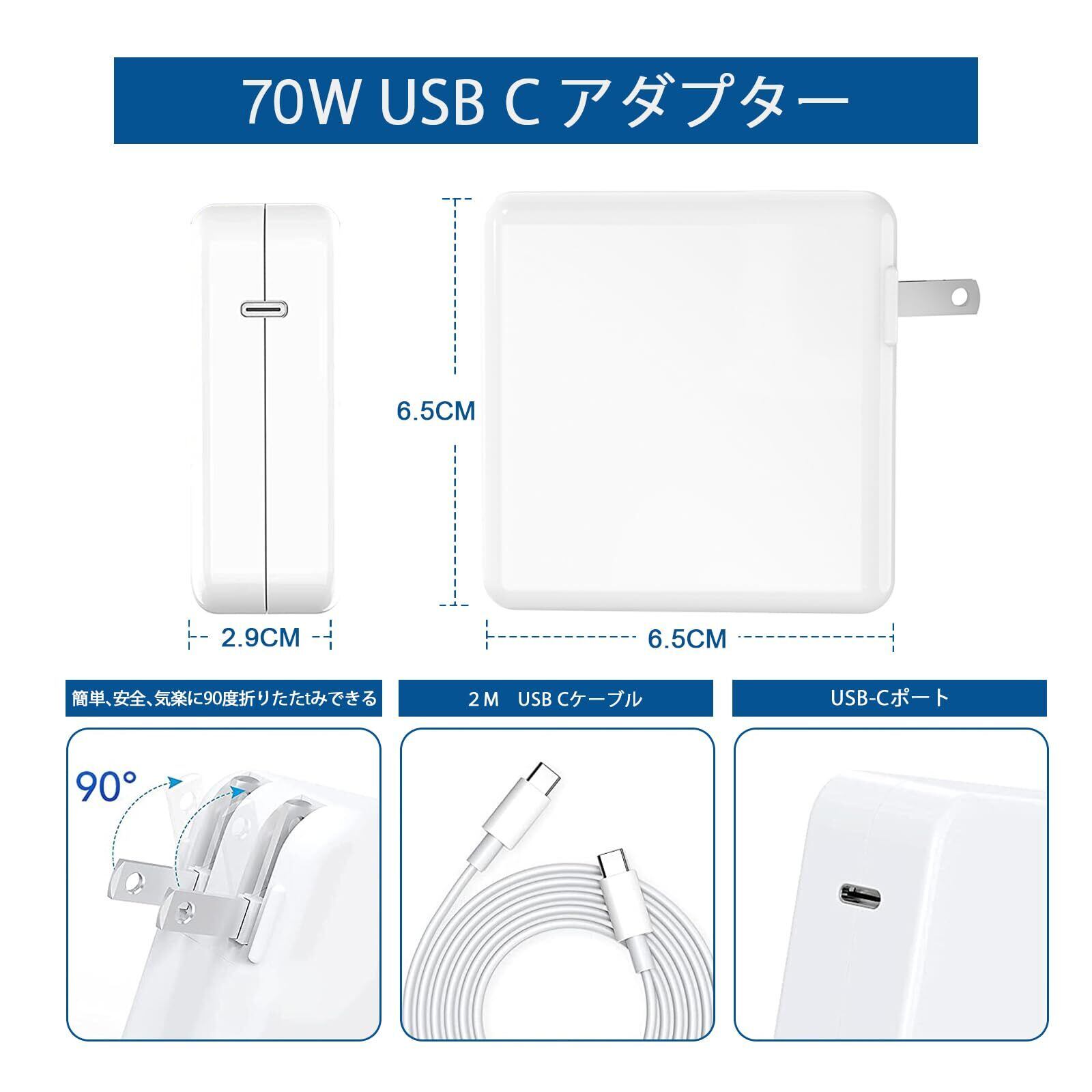 Macbook Pro 充電器 Type C PD対応 70W タイプc アダプタ type-c Mac/Lenovo/レノボ ACアダプター 急速充電 1.8mケーブル 【GaN+(窒化ガリウム)&折畳式プラグ&PSE認証】 67W/65W/61W/45W 電源アダプタ Mac Book Pro対応/ノートPC/Switch/各種USB-C機器対応