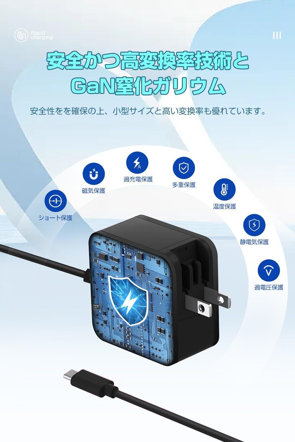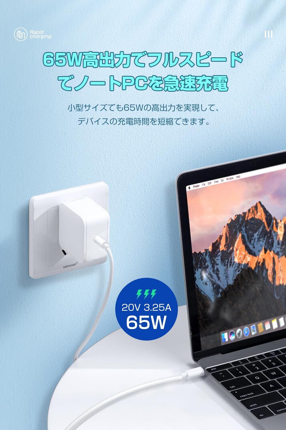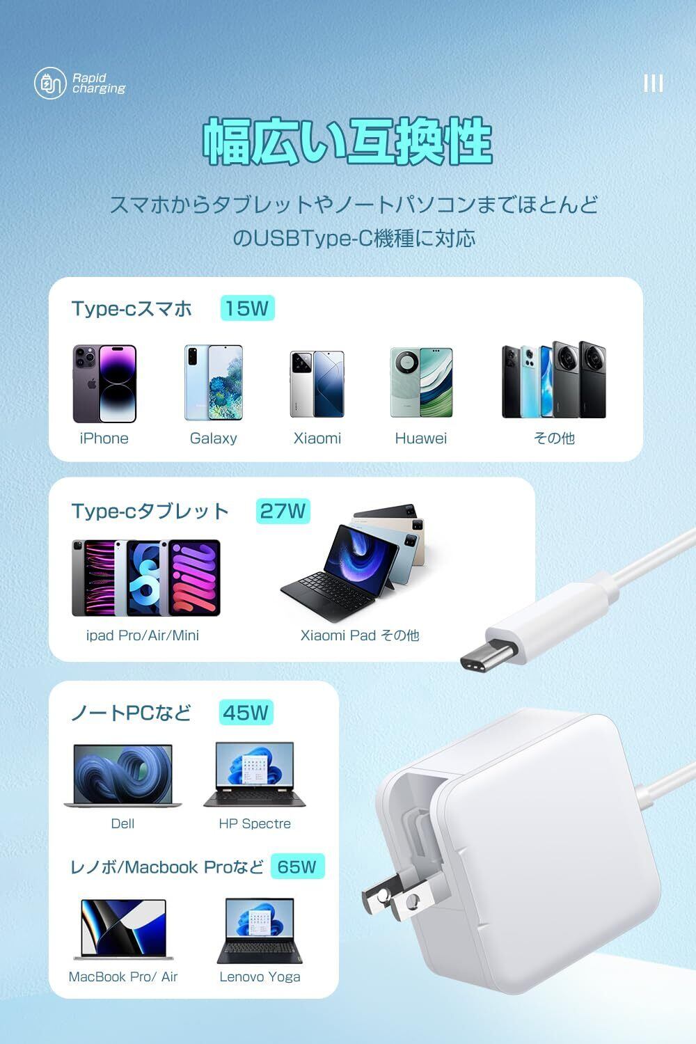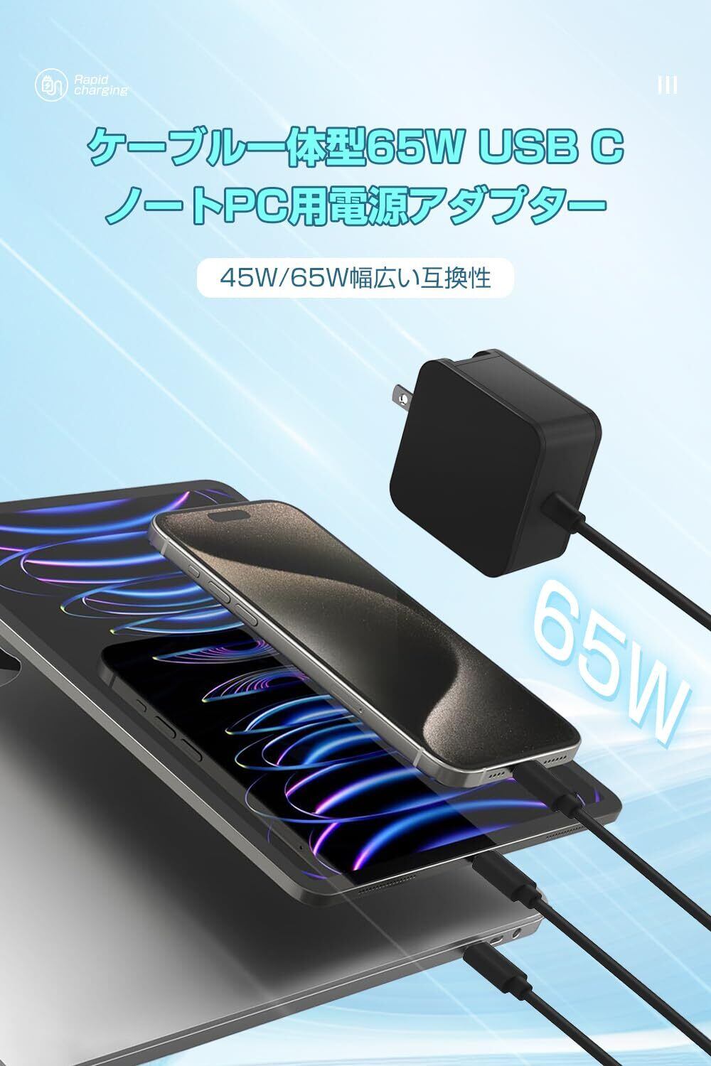 【極小サイズ&ケーブルと一体型】タイプc パソコン 充電器 65Wは最新のGaN(窒化ガリウム)技術を採用し、小さくて高出力の65w usb-c 充電器を実現しました。pd 充電器 65wは従来のシリコン充電器よりも50%以上小さくなります。サイズは5cm*5cm*3cm、ケーブルを合わせる重さは僅か129g、通常の65w充電器よりサイズが50%以上小さくなりました。手のひらに収まるほどで、ACプラグも折り畳める設計のため、小さいに収納できて持ち運び便利です。