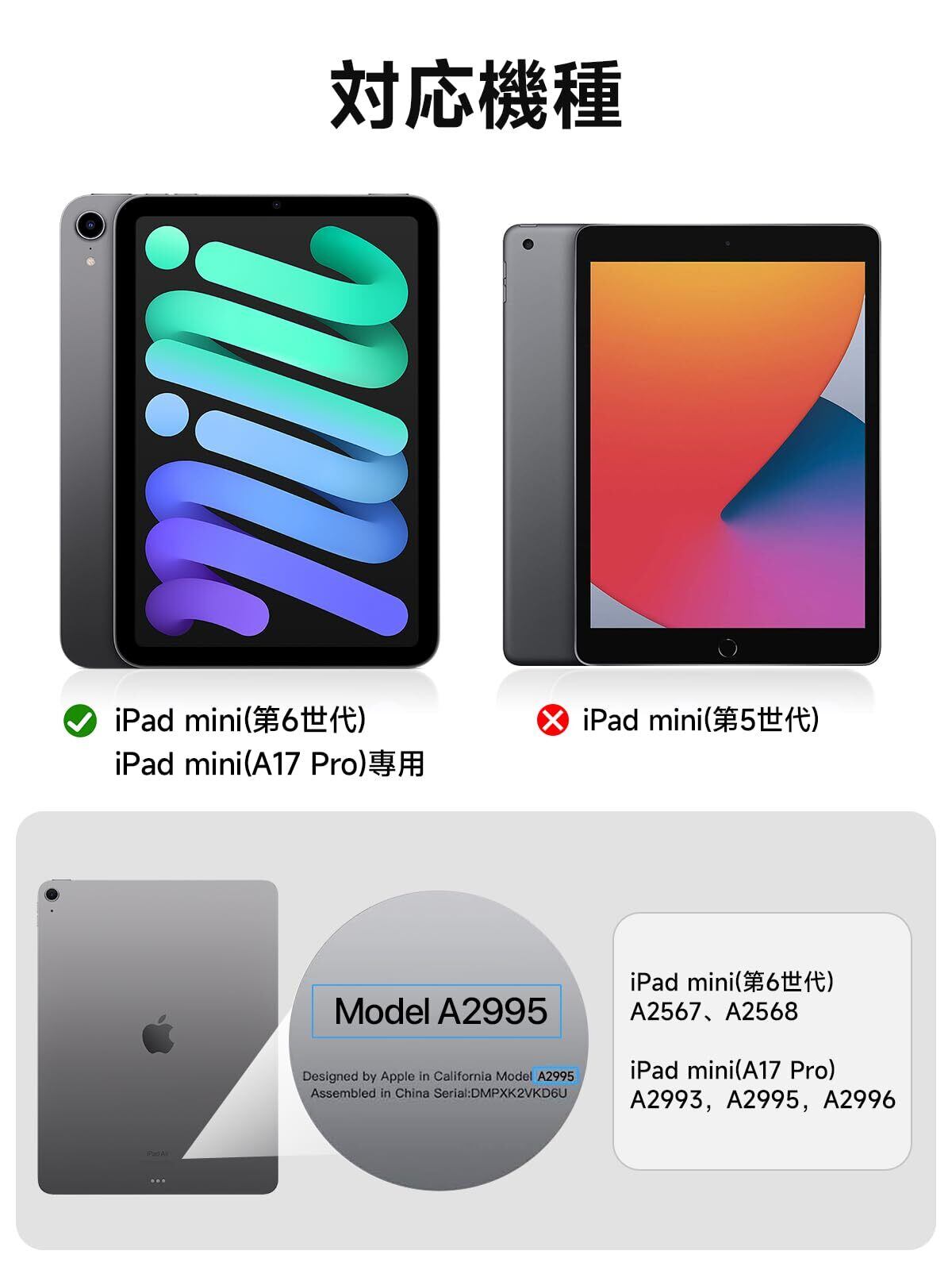 【対応機種】 iPad mini7 (A17 Pro・2024年モデル)、iPad mini 第6世代 (8.3インチ・2021年モデル) に専用設計されたケース。対応モデル番号:A2895、A2896、A2897、A2567、A2568、A2569。購入前に必ずお手持ちのiPadモデル番号をご確認ください。