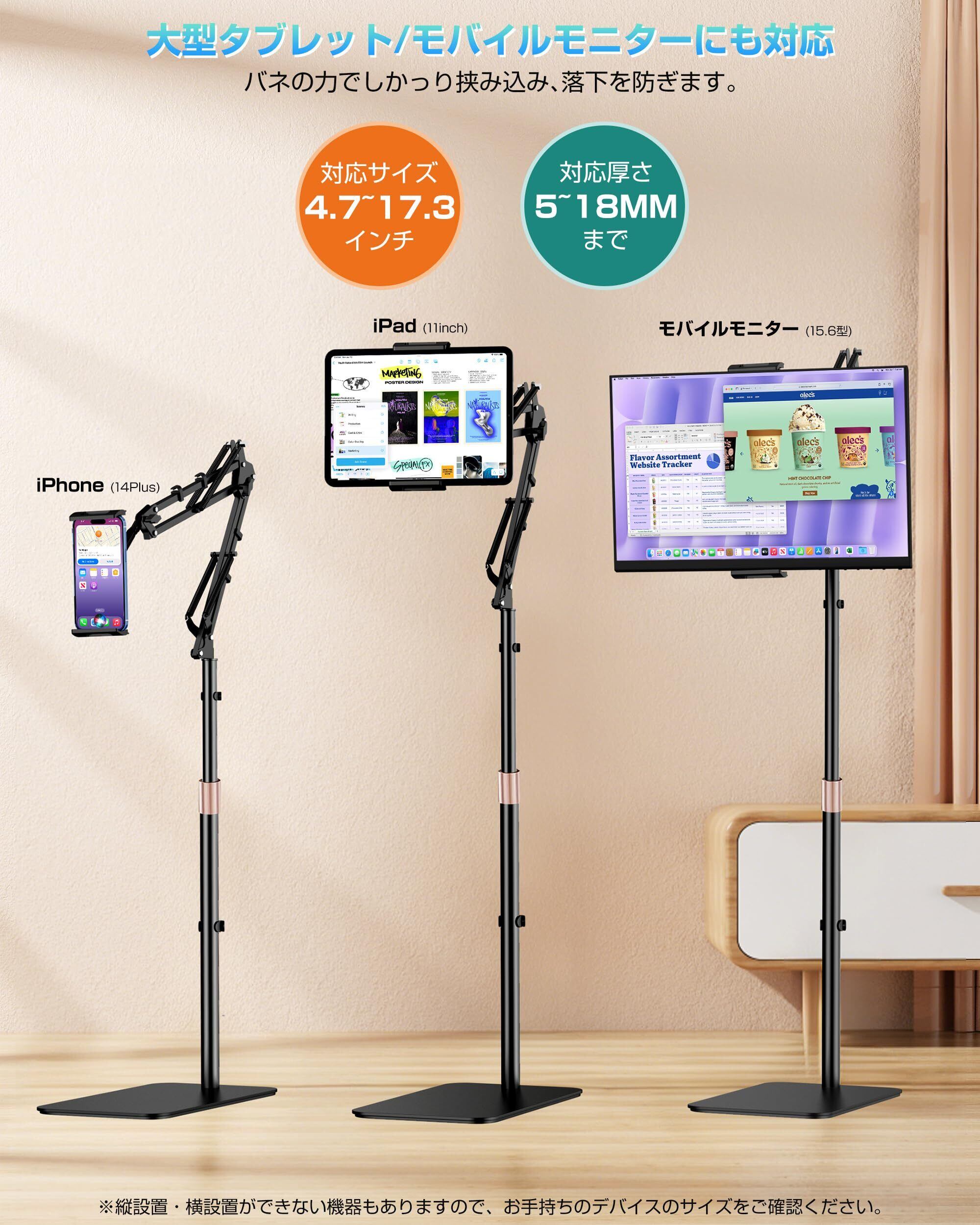【新着商品】タブレット スタンド 床置き 伸縮式 iPadアーム 寝ながら 4.7-17.3インチ対応 45-140CM高さ調整 2.0KG耐荷重 小物置台付き 土台強化 360度回転 スマホ/タブレット/モバイルモニタ対応 ブラック