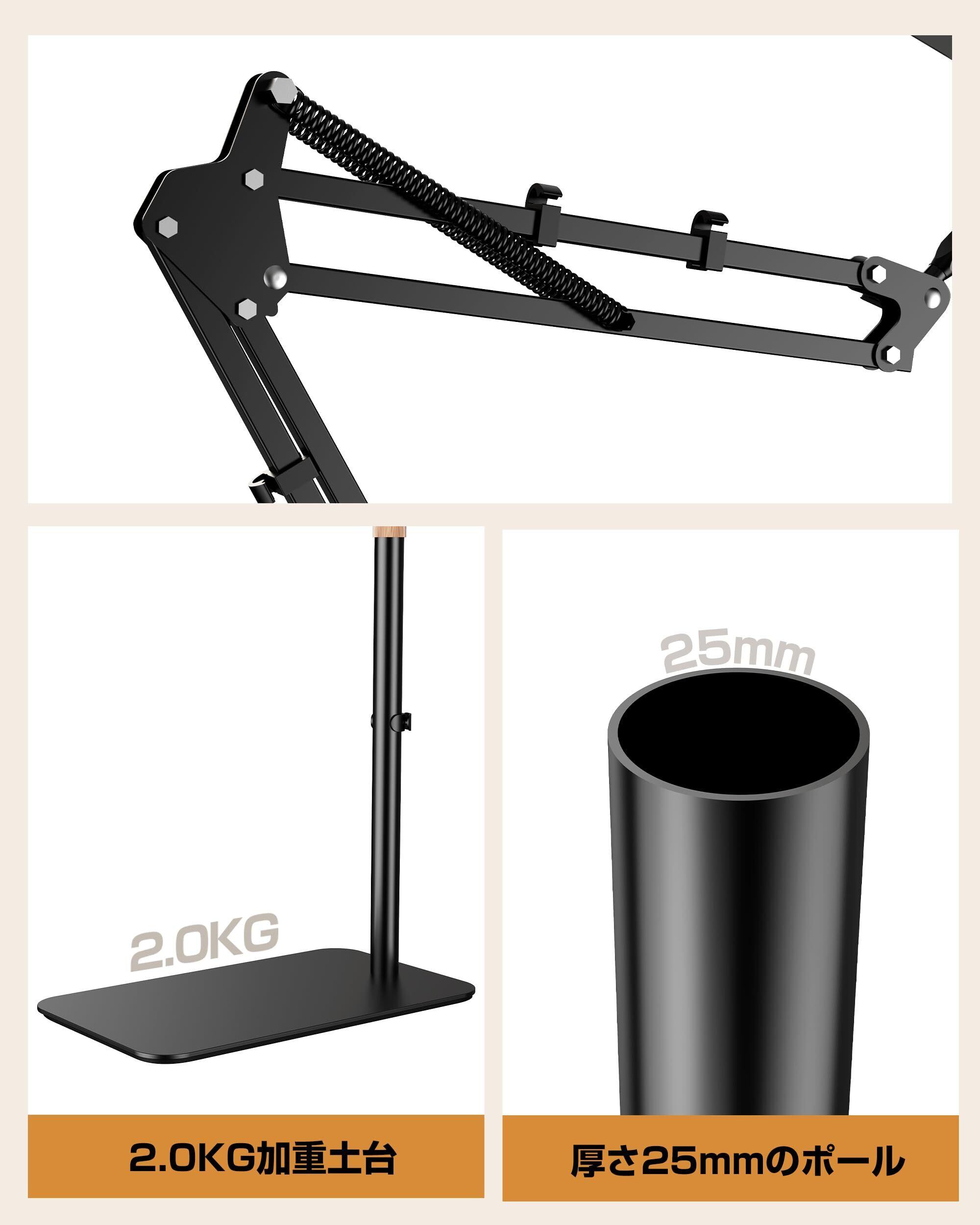 タブレット スタンド 床置き 伸縮式 iPadアーム 寝ながら 4.7-17.3インチ対応 45-140CM高さ調整 2.0KG耐荷重 小物置台付き 土台強化 360度回転 スマホ/タブレット/モバイルモニタ対応 ブラック