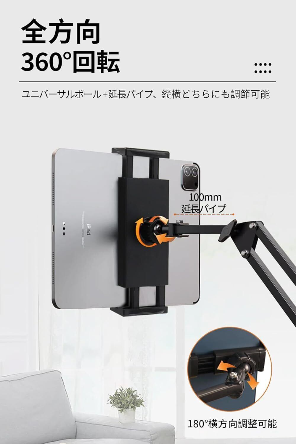 【多様な調節で視野を自由に操る】当社のタブレットスタンドは、ユニバーサルボール機構と 100 ミリの伸長パイプを完備しており、驚くほどの柔軟性を誇ります。タブレットスタンドの縦横の切り替えがスムーズで、底部が 360 度全方位回転し、また、横方向に 180 度の調節と 180 度の折り畳み機能も備えているため、ドラマ鑑賞時にはストーリーに寄り添い、ライブ配信では最適なショットを捉えることができ、様々な使用状況において、ユーザーのあらゆる視点ニーズを的確に満たすことができます。タブレットスタンドによってタブレットの角度設定は自由自在で、全てがユーザーの手の内に収まります。