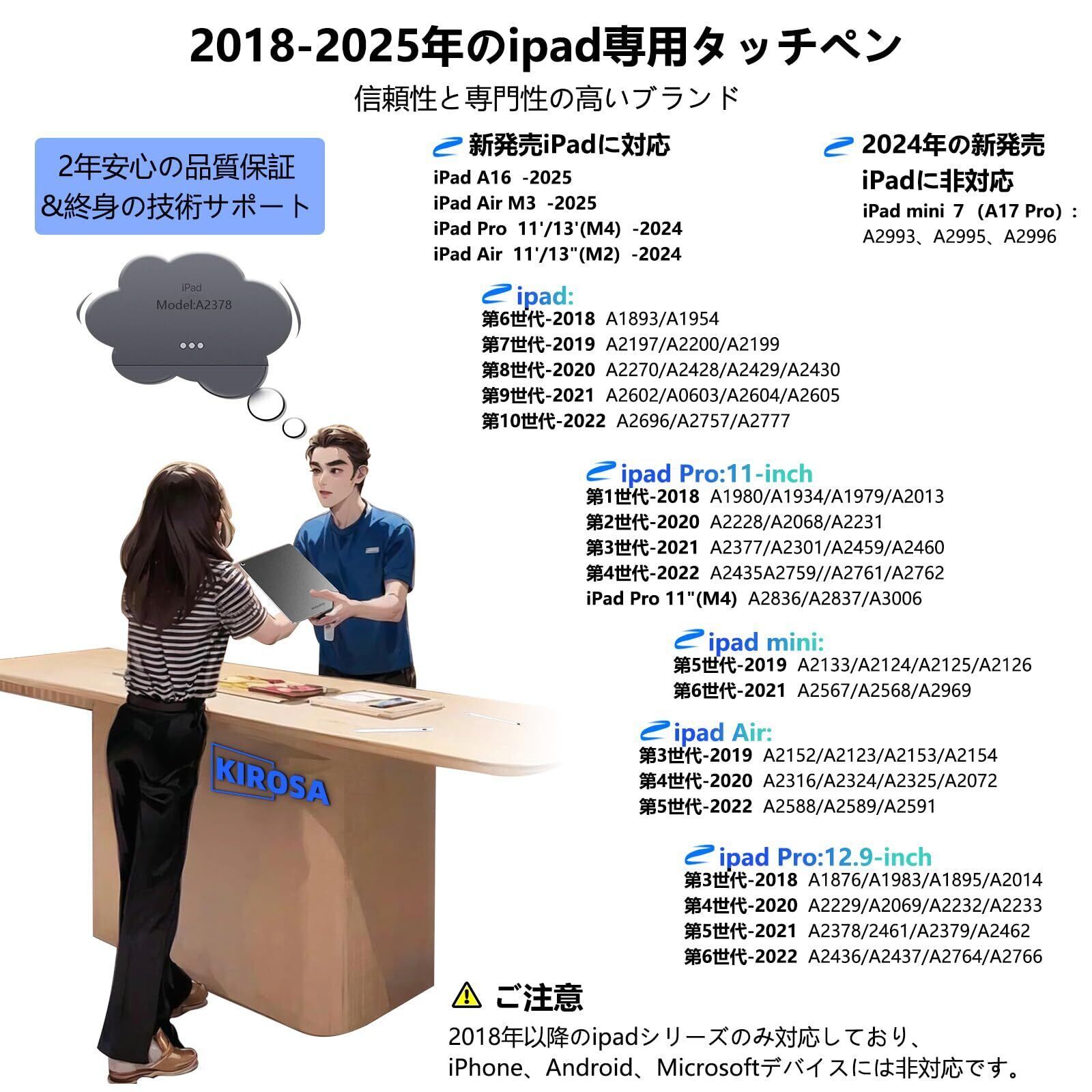【2018年以降のipad専用タッチペン&2年安心の品質】 KIROSA K17 タッチペンは信頼性と専門性の高いブランドによるプロフェッショナルなサービスと2年の安心の品質、終身の技術サポートが提供します。対応機種:ipad (第6/7/8/9/10世代)、ipad Pro (第3/4/5/6世代) 、 ipad Pro 11インチ、ipad Air (第3/4/5世代) 、ipad mini (第5/6世代)。ご注意:購入前に、ipadのモデルを確認してください。