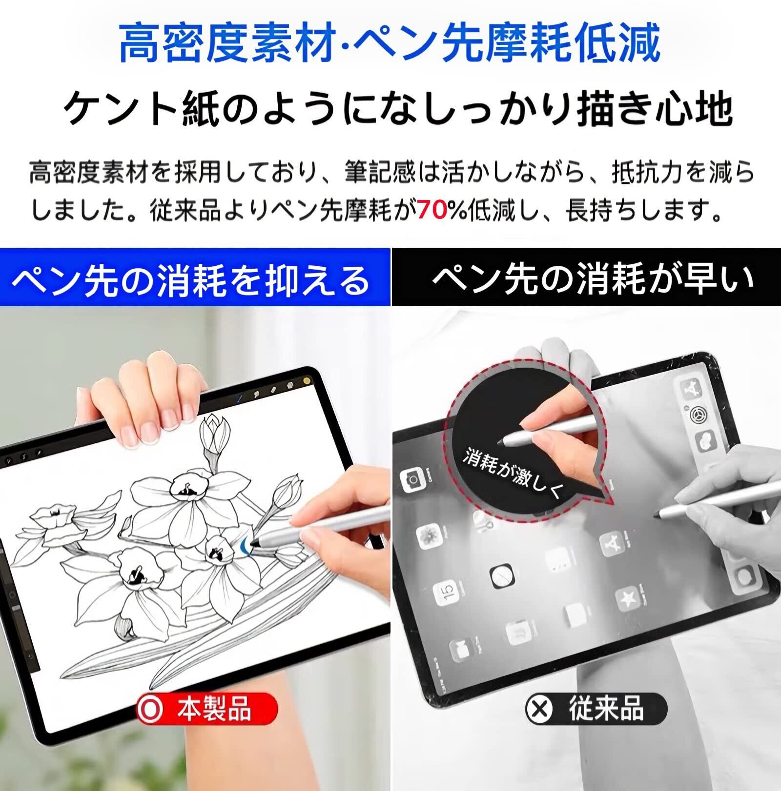 最新素材を採用しや表面特殊加工によりペン先の磨耗を80%低減させるため、タッチペンを長く使用できます。※鉛筆硬度3Hのハードコート加工により、フィルム表面の傷にも防止します。