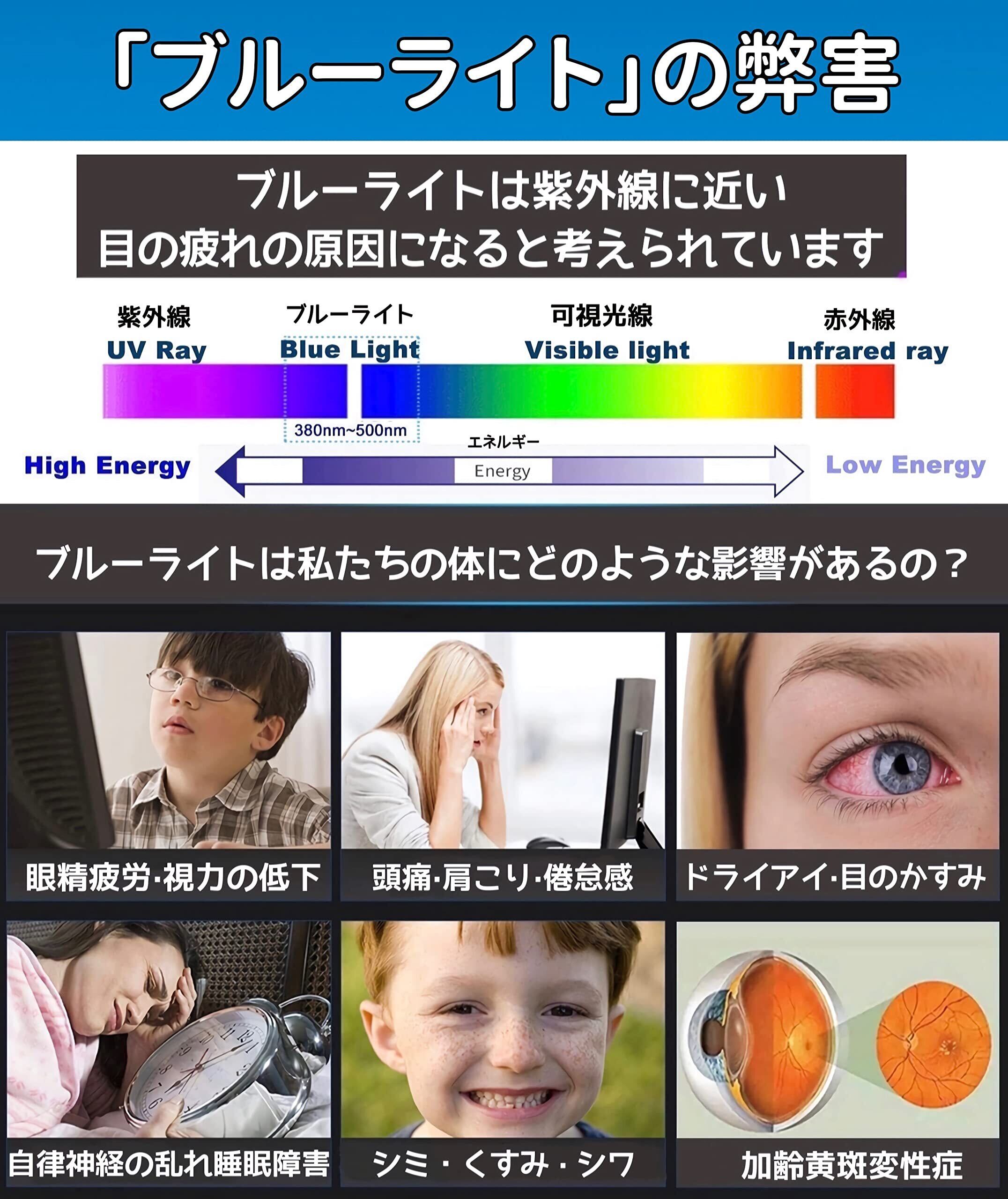 ブルーライトカット:ブルーライトは眼の疲れだけでなく身体に悪影響、頭痛、不眠などの原因になります。こちらのフィルムは液晶画面から放出されるブルーライトがカットできます。さらに全光線透過率は高くて画面を見やすく、ブルーライトを効率的にカットするバランスを実現しました。対応機種本体の液晶画面を保護するだけでなく、目に影響を及ぼすブルーライトを色調を崩すことなく低減し、まぶしさやチラつきを抑えます。