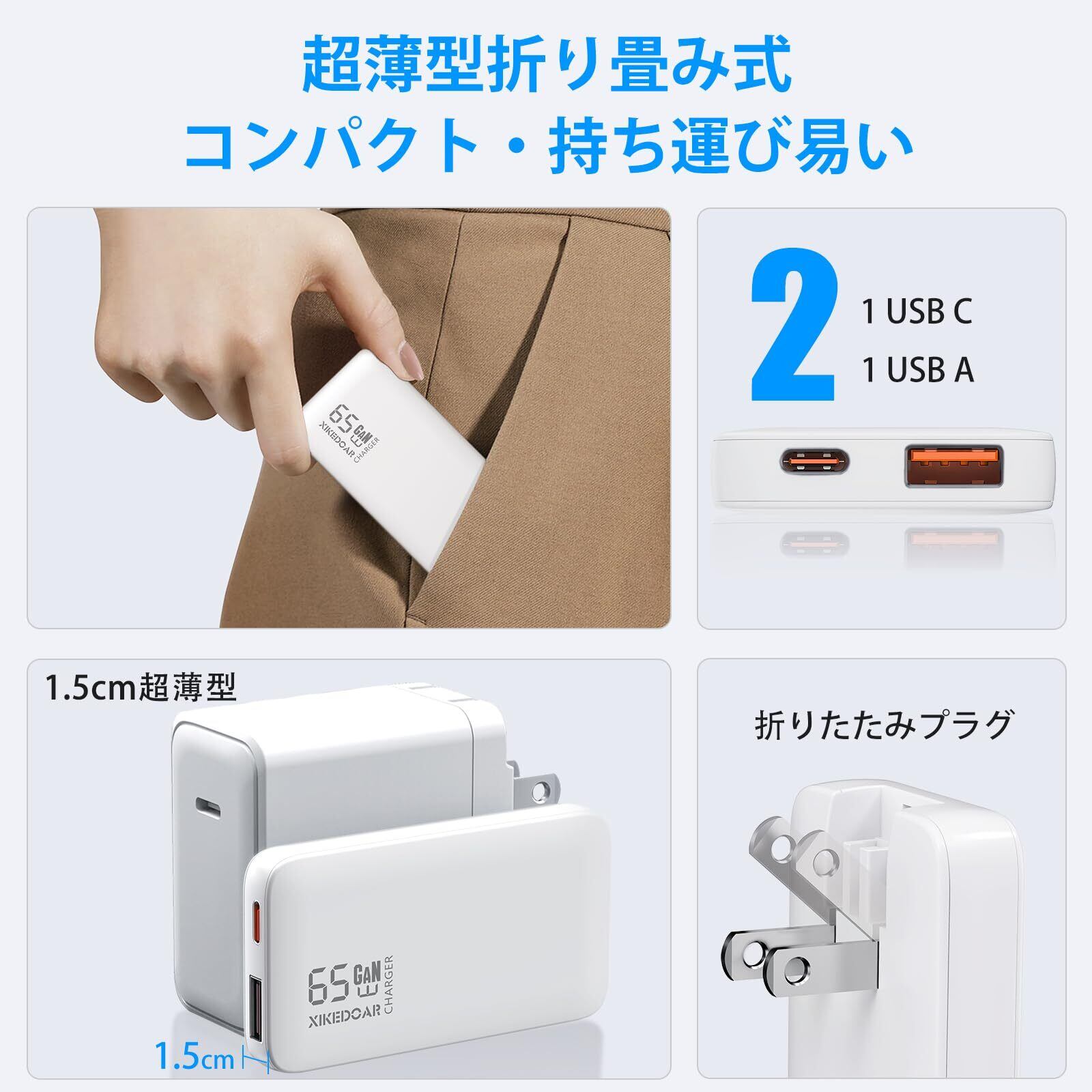 【2022最新】USB-C 充電器 65W/45W 薄型 PD/PPS/QC対応 Type-Cケーブル付き 1USB-C&1USB-A1ポート パソコン/スマホ/タブレット 折畳式 ACアダプター Dynabook, LifeBook, Chromebook, MacBook, DELL, HP, Lenovo, iPad, iPhone, Android, Galaxy等対応 電源アダプター