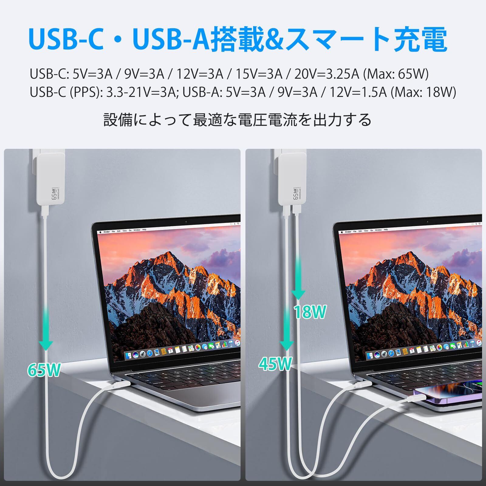 USB-C 充電器 65W/45W 薄型 PD/PPS/QC対応 Type-Cケーブル付き 1USB-C&1USB-A1ポート パソコン/スマホ/タブレット 折畳式 ACアダプター Dynabook, LifeBook, Chromebook, MacBook, DELL, HP, Lenovo, iPad, iPhone, Android, Galaxy等対応 電源アダプター