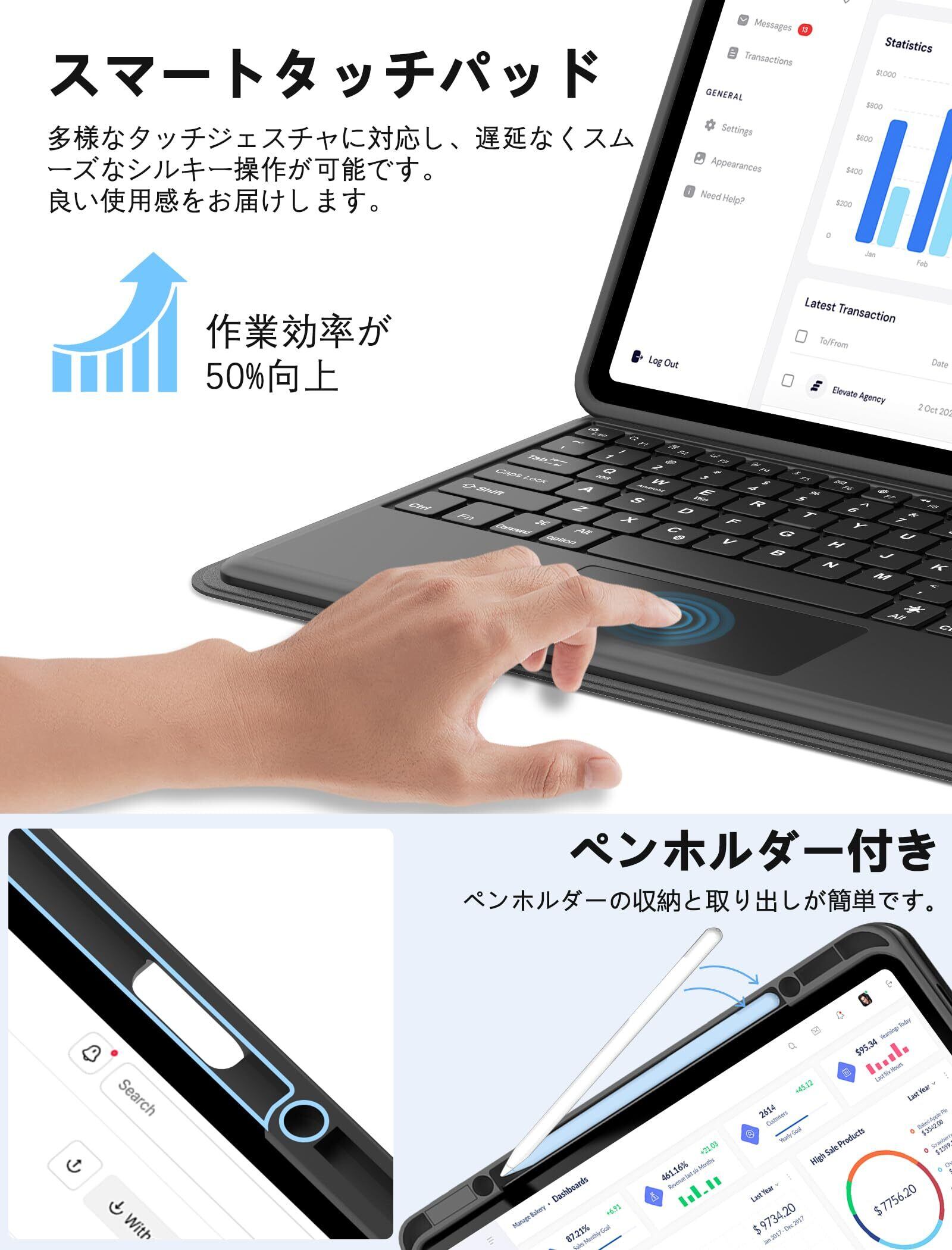 【タッチパッド&ショートカットキー】本製品はスマートタッチパッドを搭載し、マルチタッチジェスチャーで書類編集・アプリ操作・プレゼン作成がスムーズに行えます。作業効率を高めるファンクションキーも装備し、iPadをノートPCのように快適に操作可能。作家、デザイナー、専門家、学生など、多様なユーザーに最適なキーボードケースです。