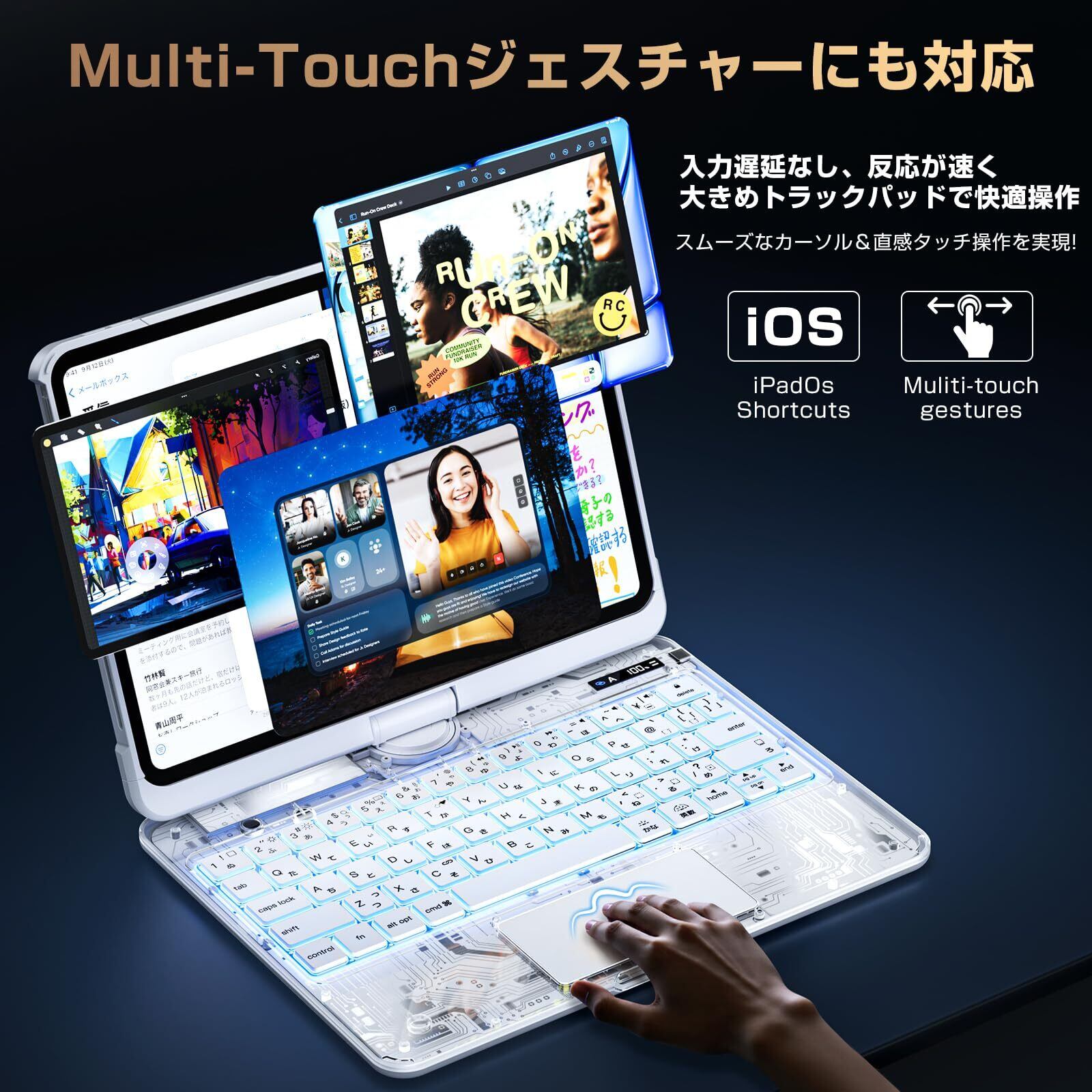 【高精度・高感度トラックパッド】iPadOS専用設計のトラックパッドを搭載し、Multi-Touchジェスチャーにも対応。スムーズなカーソル操作と直感的なタッチ操作を実現します。反応が速く、大きめのガラス製トラックパッドで快適な操作性を確保。ウェブブラウジング、ドキュメント作成、画像編集など、あらゆる作業の効率を大幅に向上させます。 タッチパッドを革新。従来のキーボードケースで発生していた遅延問題を解決するため、iPad専用チップを採用し、快適な操作性を実現しました。2~4本指のジェスチャー操作にも対応し、スクロールやズーム、アプリ切り替えなどを直感的に行えます。