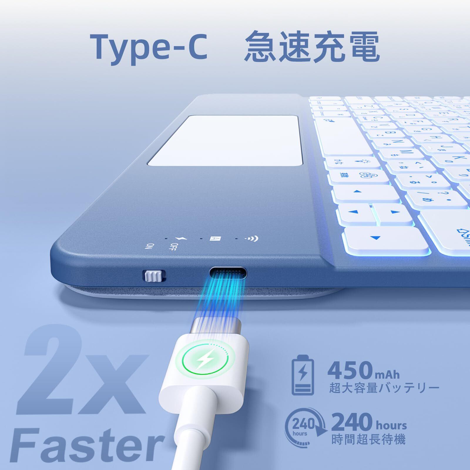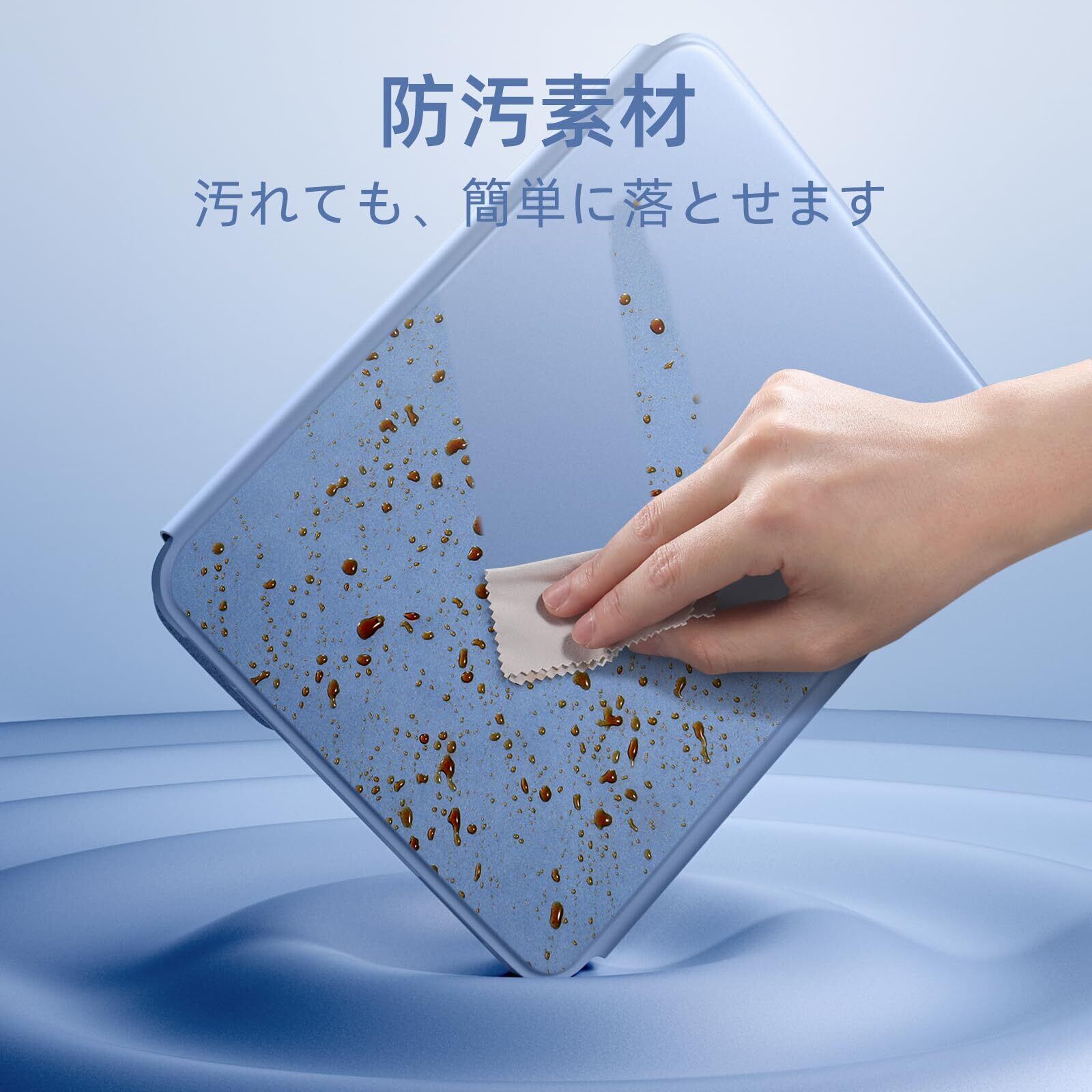 【防汚素材&7色のバックライト】このipad キーボード付きケースは、防汚素材を採用しています。コーヒーのしみや指紋、ほこりなど、あらゆる汚れを簡単に防ぎます。汚れが付着しにくく、布で軽く拭くだけで、すぐにきれいになります。iPad をしっかりと保護するだけでなく、常にケース自体も清潔な状態を保ちます。ケースは防汚加工済みのセミシリコン素材を使用し、手触りが良く耐久性も抜群。キーボードに7色のバックライトを内蔵。暗い場所でも快適に作業可能!