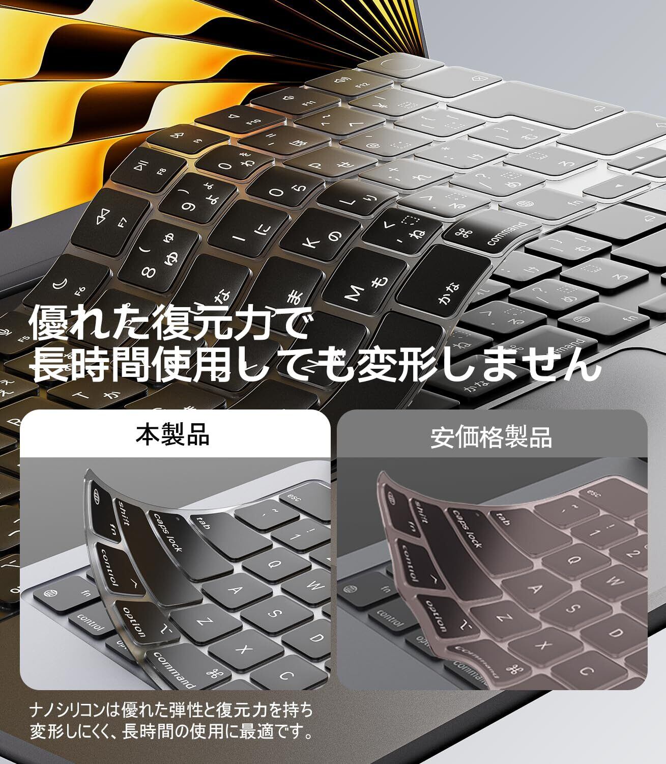 【超薄0.3mmで打鍵感を損なわない】 高精度カット採用の超薄型シリコン素材が、MacBookのキーボードにぴったり密着。キーの沈み込みや打ちにくさを感じさせず、快適なタイピングを実現します。
